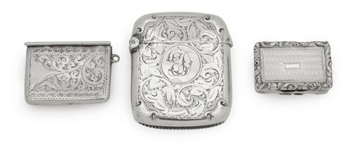 24. A George IV silver vinaigrette, Victorian vesta case and stamp box the vinaigrette, by John Thropp, Birmingham 1827, with engine turned decoration, to a foliate border, the gilt interior with a pierced floral grille, the vesta case, by Synyer & Beddoes, Birmingham 1898, the centre with engraved initials, and the stamp box, in the form of a letter, marked Sterling (3), vinaigrette width 2.5cm, stamp box width 3cm, vesta case height 4cm, total 0.99ozt £100-£150