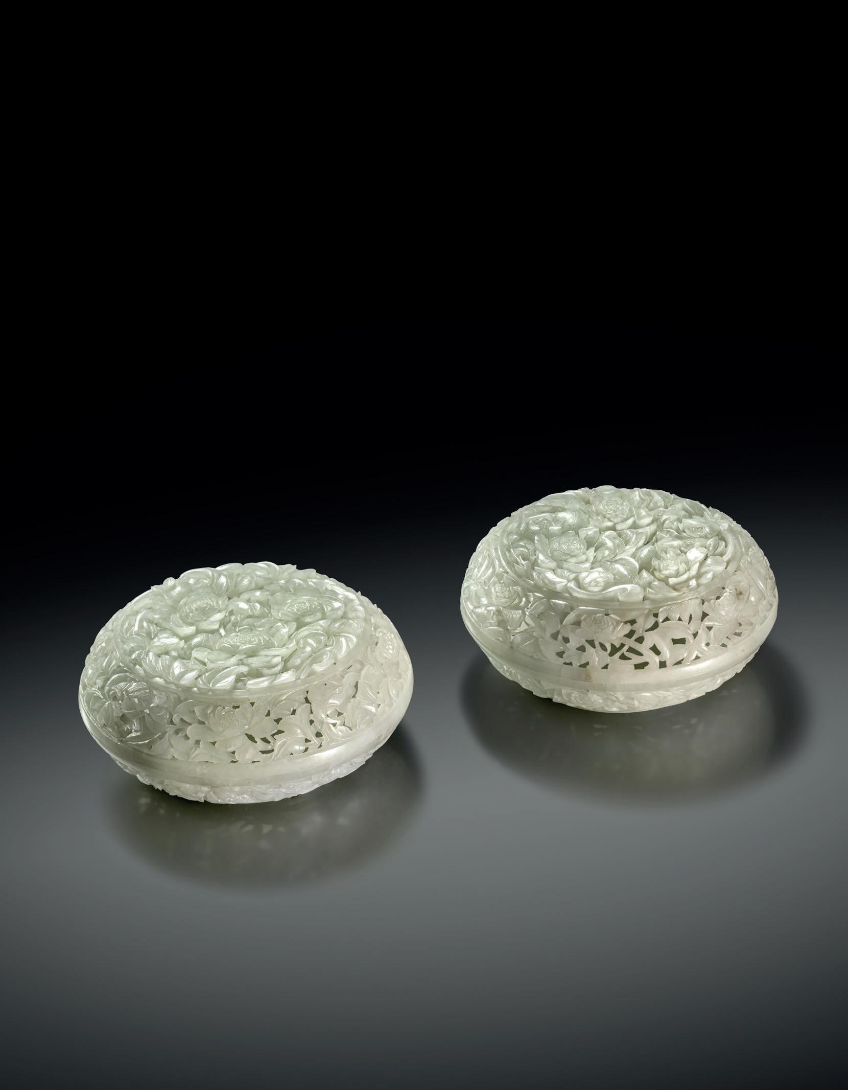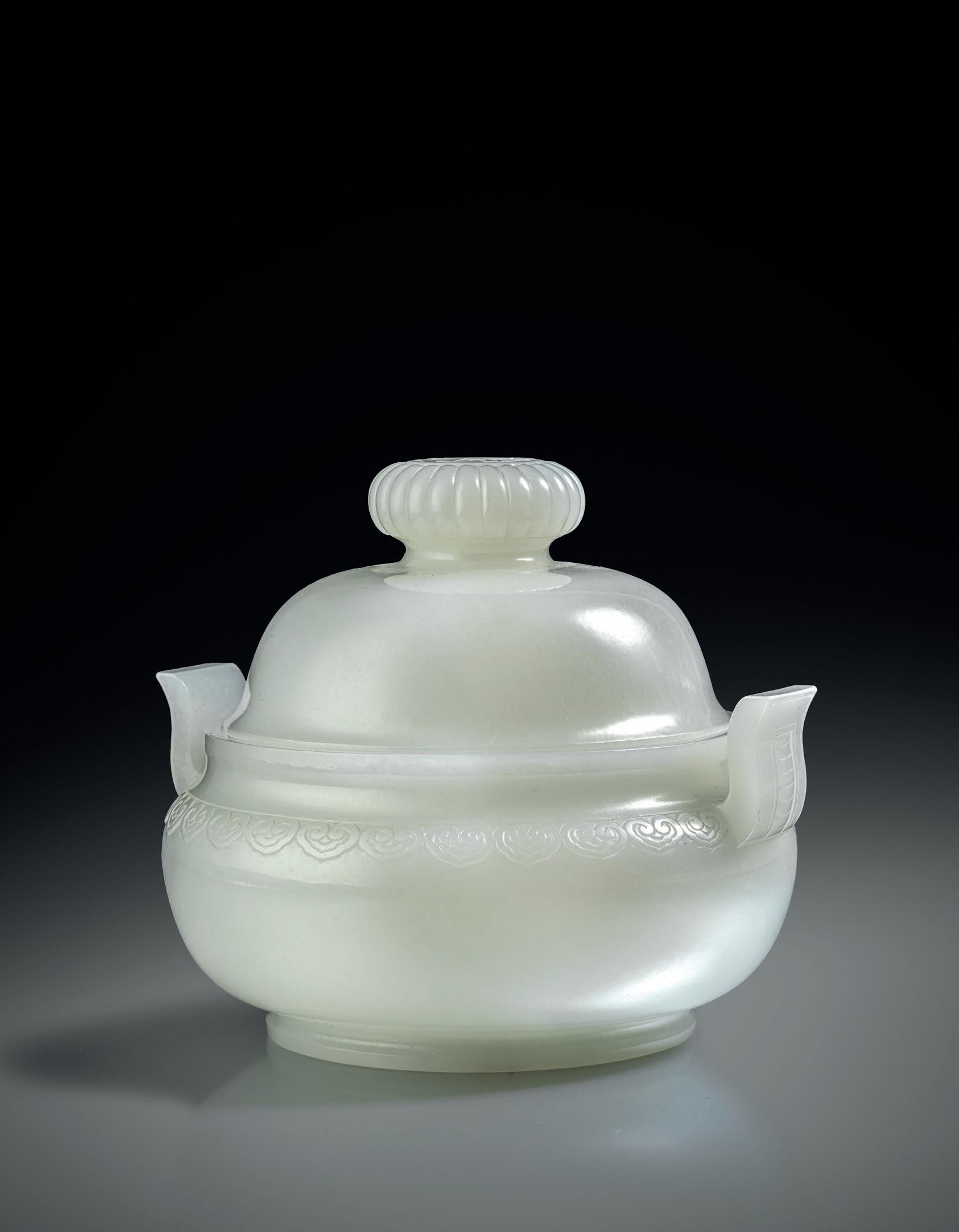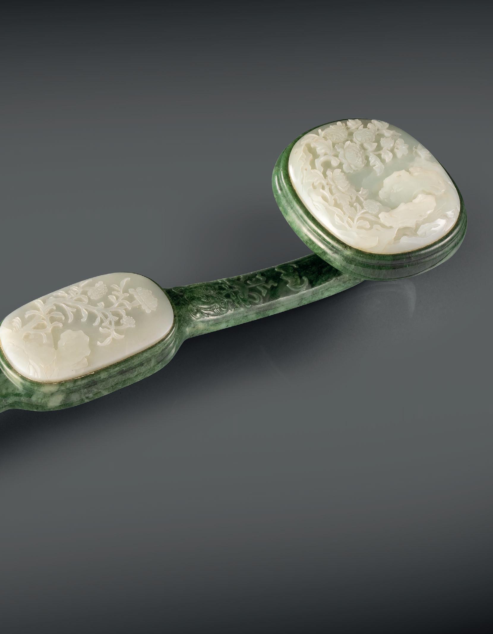 軟玉或和闐玉是最常被分辨為「玉」的物質。它由透閃石和陽起石組成,主要產於新疆省的和闐和葉爾羗附近等地。 和闐玉的供應一直十分稀少,直到十八世紀乾隆帝(1736-1795 年)在 1755 年至 1760 年期間多次出兵西征中亞, 開疆拓土,將清廷版圖擴大至蘊藏大量和闐玉新疆地區。大量上乘的玉礦資源使清代玉雕工匠有機會製作華麗的 大型玉雕作品。要數到清代最具代表性的大型玉雕,不得不提現藏於紫禁城北京故 博物院,重達 5300 公斤,清乾 隆時期的青玉大禹治水圖山子。這類用料講究,設計巧妙的玉雕作品不時在背面或側面刻有御制詩或銘文。如此次 上拍的一對清乾隆白玉雕如意壽紋花瓣蓋罐的盖鈕(拍品編號 18)則刻有「壽」字銘文。