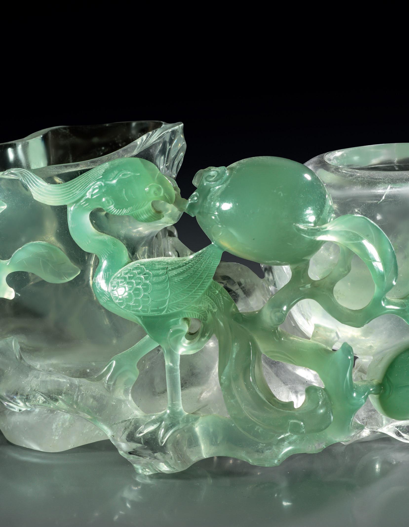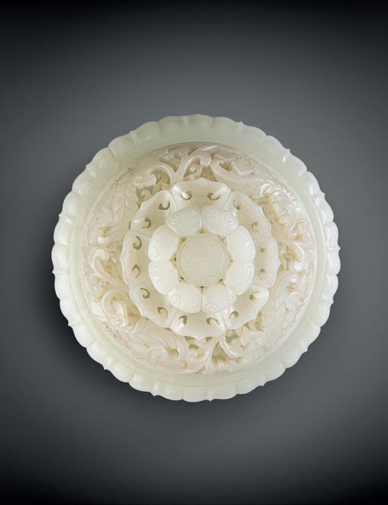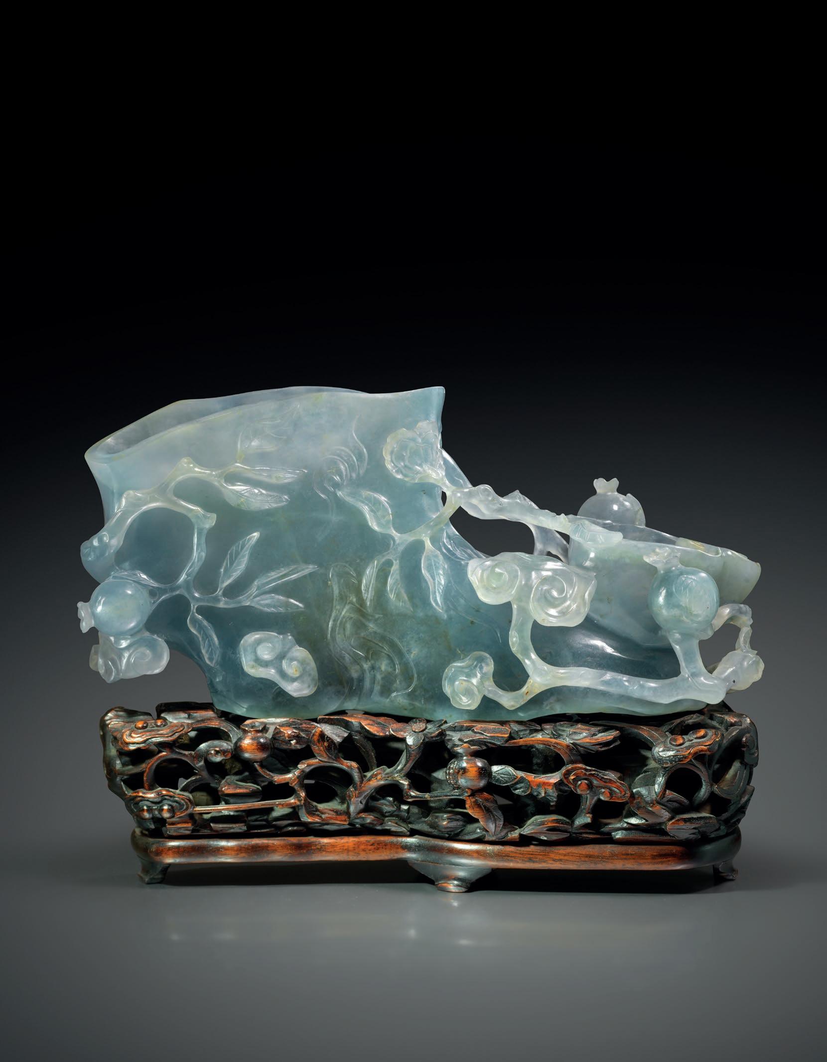 To create elaborate pieces several jade carvers had to work together, often taking several years to complete the projects. Archive materials from the Construction Department of the Imperial Household Ministry ( 內務府造辦處 ) show the production of jade objects to have been of very specific importance for the court and even to have developed into a symbol of prosperity and a well-ordered state in the Qianlong era. Imperial pieces were often incised with a reign mark, as does the quatrefoil stand (lot 4) that has a reign mark incised on the interior of the foot.