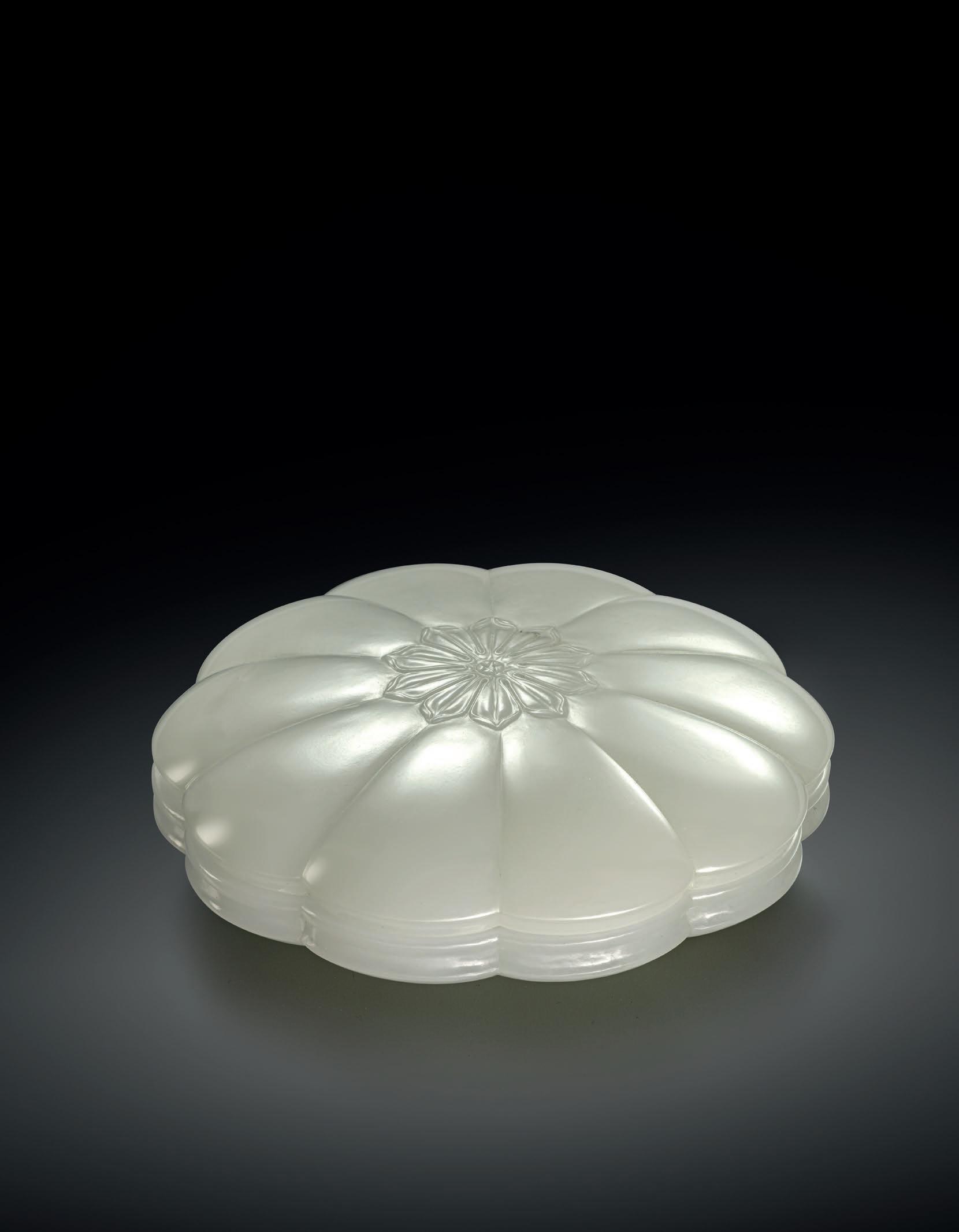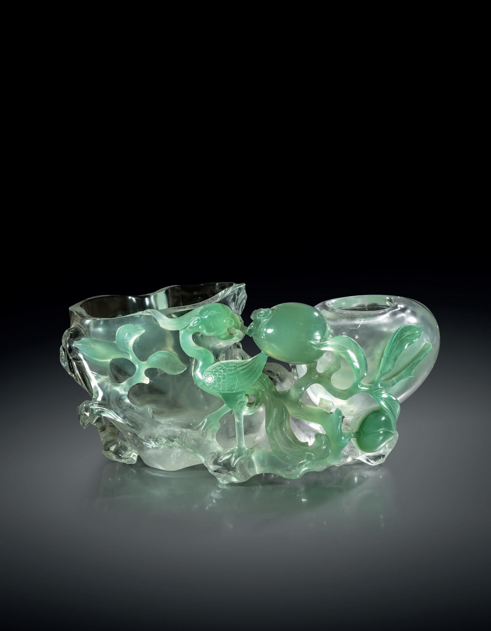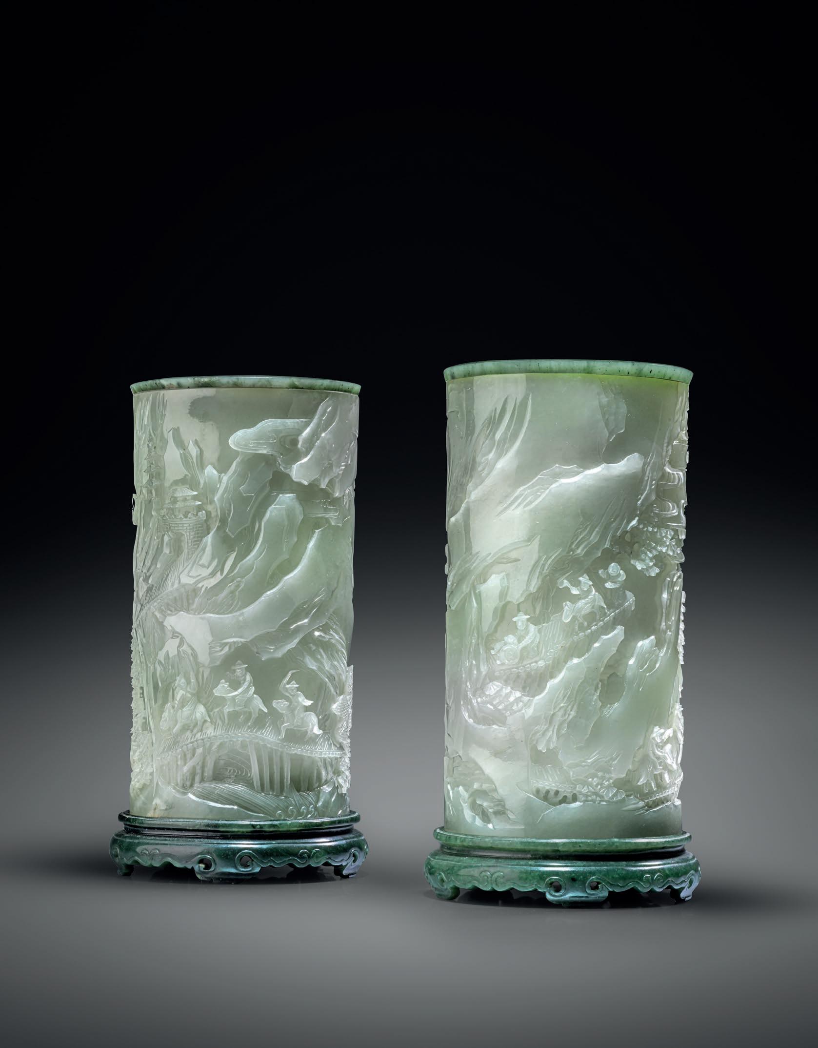 To create elaborate pieces several jade carvers had to work together, often taking several years to complete the projects. Archive materials from the Construction Department of the Imperial Household Ministry ( 內務府造辦處 ) show the production of jade objects to have been of very specific importance for the court and even to have developed into a symbol of prosperity and a well-ordered state in the Qianlong era. Imperial pieces were often incised with a reign mark, as does the quatrefoil stand (lot 4) that has a reign mark incised on the interior of the foot.