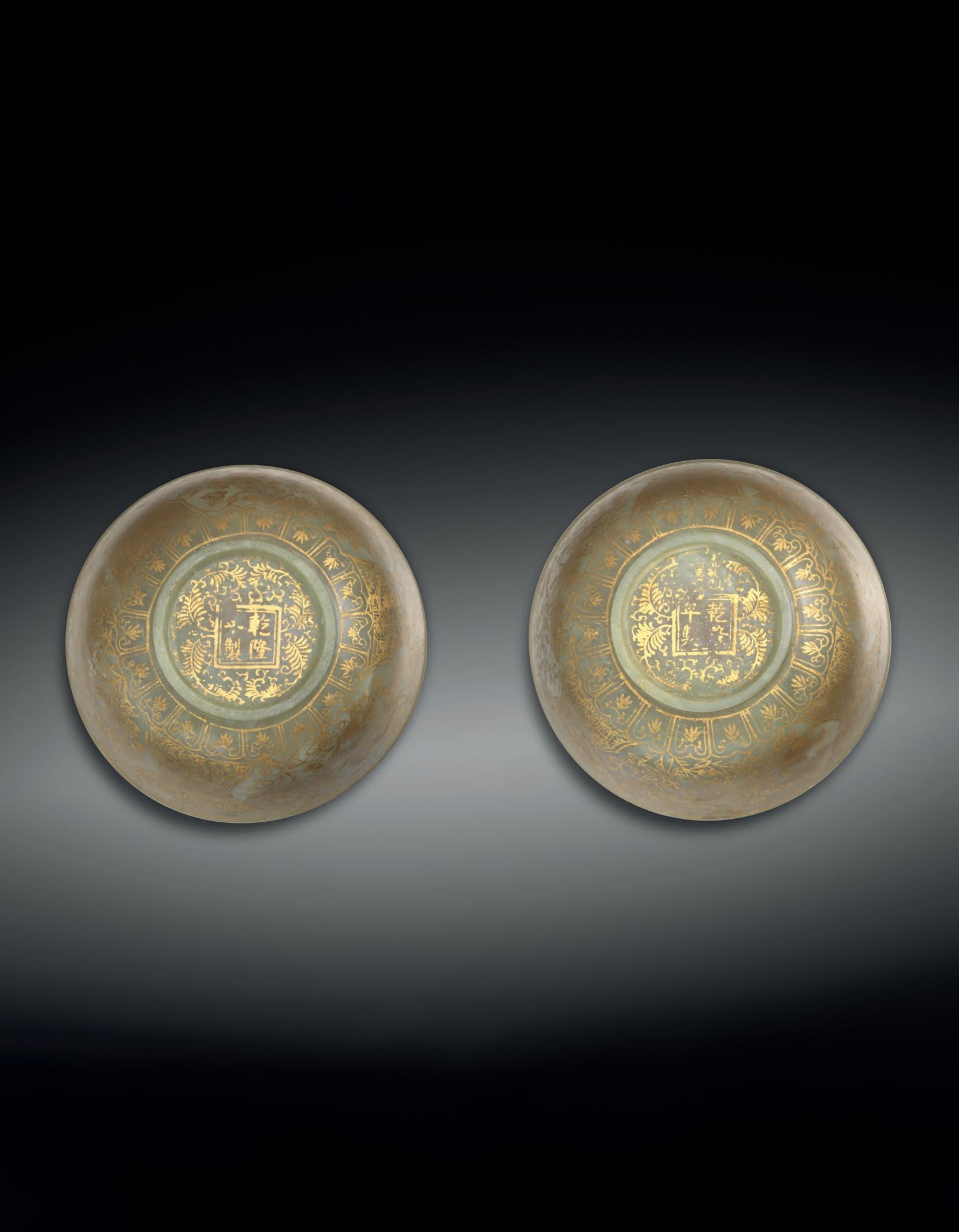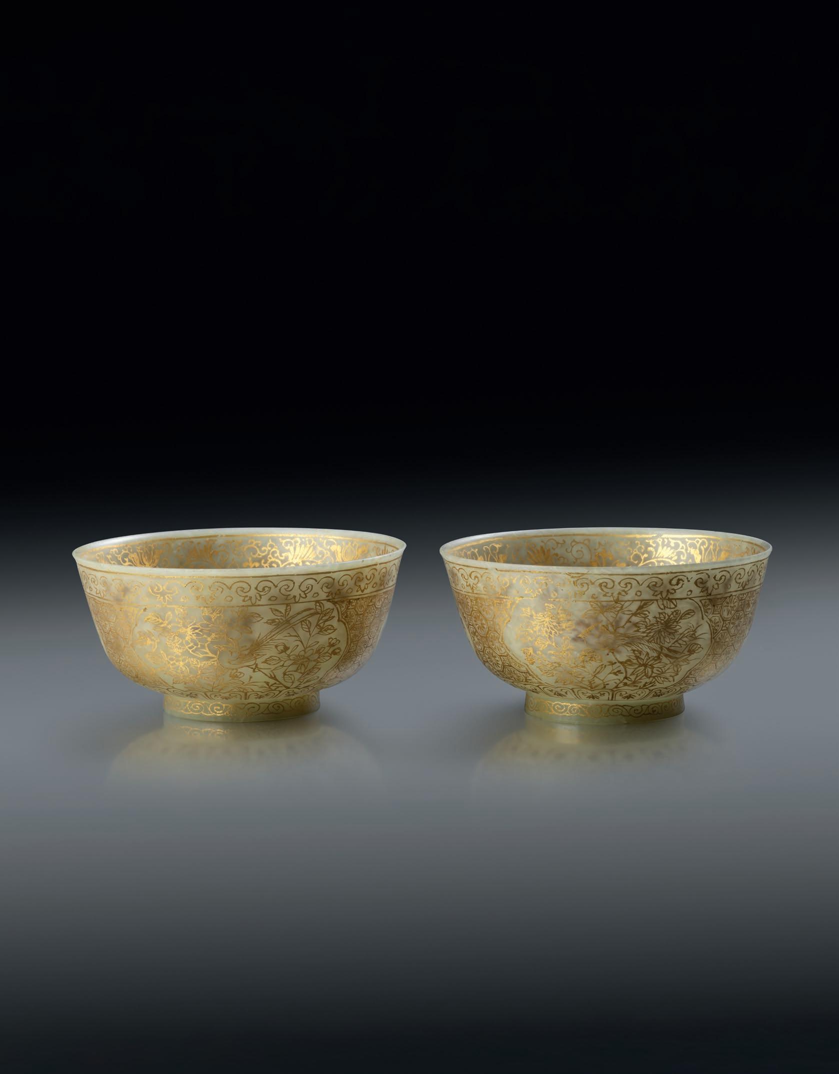 The substance jade is known as yü 玉 in Chinese. The term has semantically broader meanings than jade in English, for it has been used to describe any of the various hard greenish and whitish gems used in jewellery and artistic carvings, including jadeite. It has also been used for several minerals that carve and polish well, such as bowenite and other varieties of serpentine. An example of one of these exquisite stones is the pair of bowenite bowls decorated with gold and with Qianlong reign mark (lot 18). Jadeite is now known as yingyü 硬玉 (hard jade) and nephrite correspondingly as ruanyü 軟玉 (soft jade). The Chinese character yü dates back to eleventh century BC oracle bone script, that depicted pieces of jade hanging on a string.