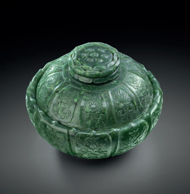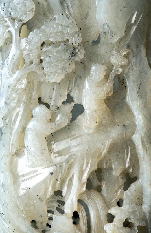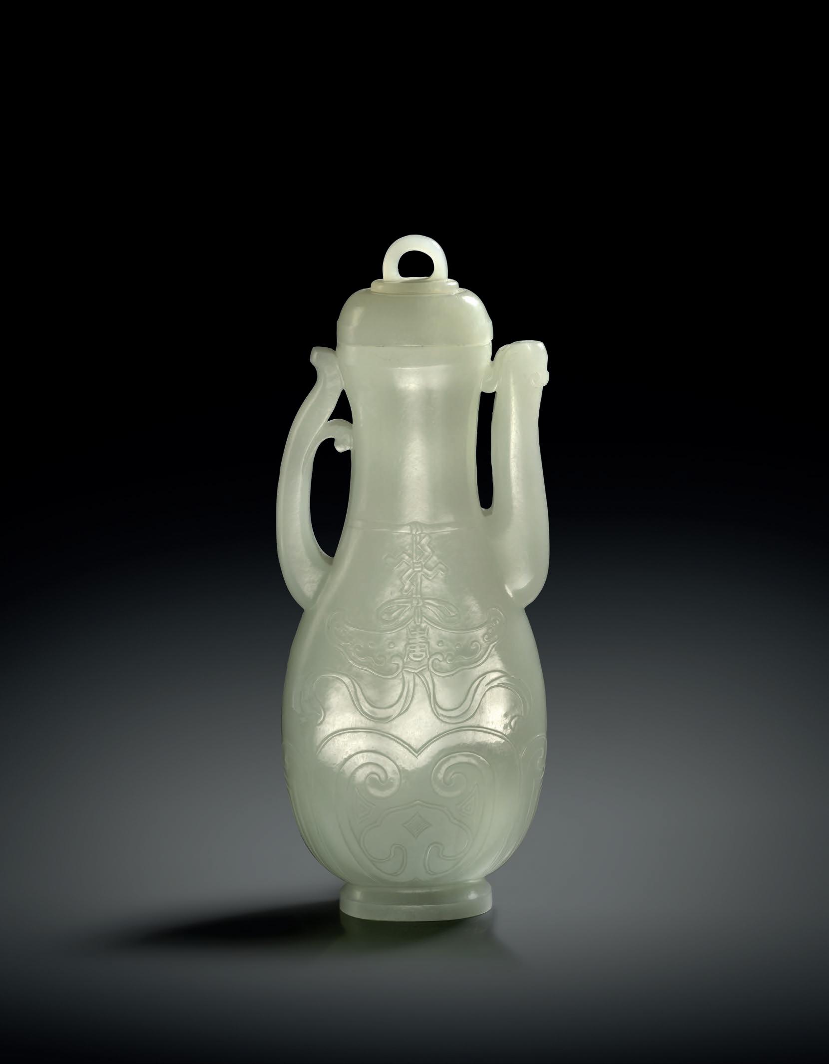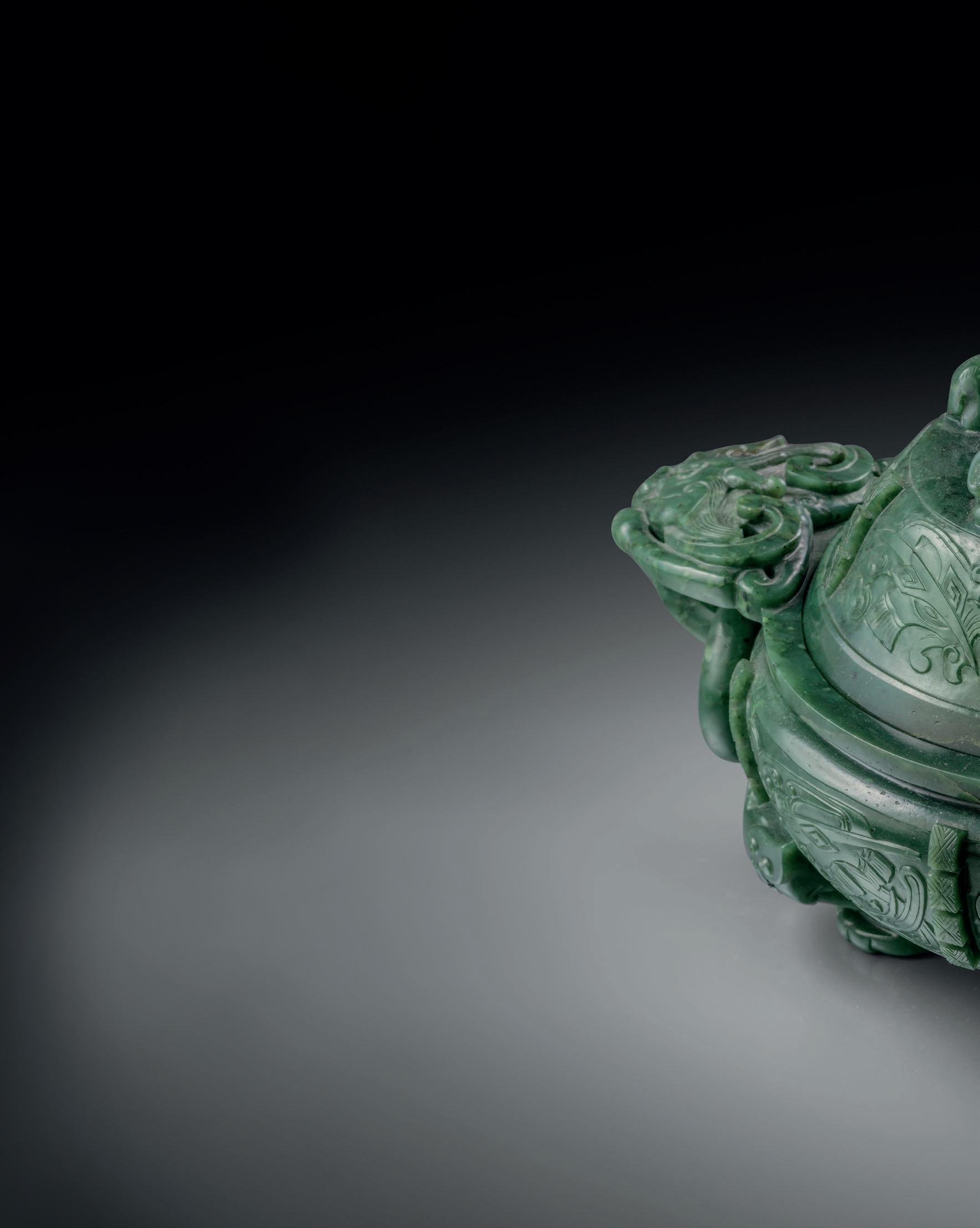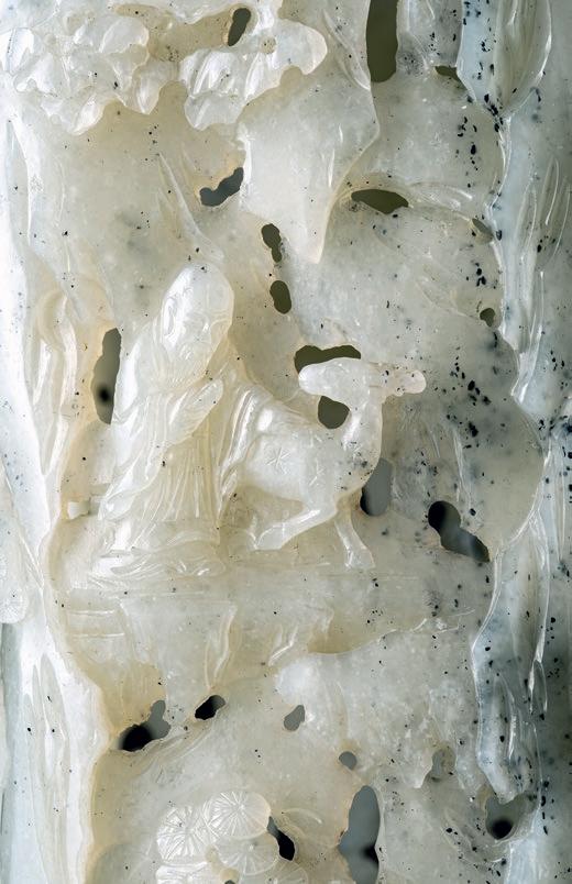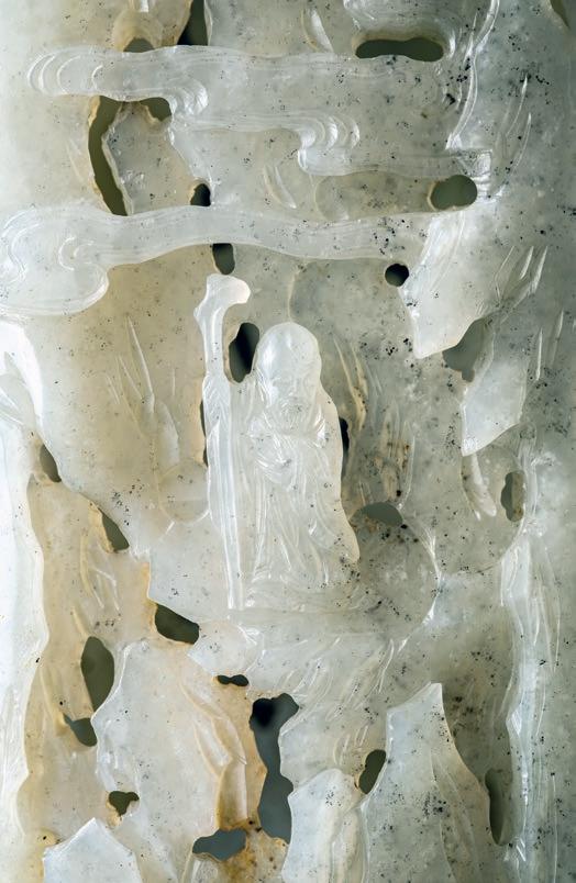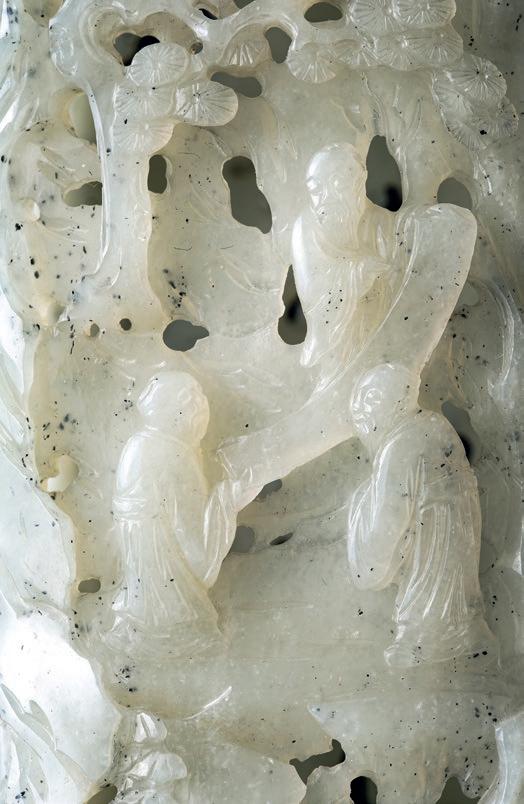 The most common substance assigned the name jade is the stone nephrite. It is composed of the minerals tremolite and actinolite and occurs mainly in areas near the central Asian cities of Khotan and Yarkand in Xinjiang province. This source of jade was in limited supply to Chinese carvers over the centuries, until in the 18th century the Qianlong Emperor (1736-95) conducted a series of successful military campaigns in Central Asia between 1755 and 1760. The Chinese Empire was thereby enlarged, including the area of present-day Xinjiang with its copious deposits of nephrite. This enabled carvers to work on massive pieces such as the huge jade mountain called Yu the Great Controls the Waters which weighs 5,300kg and is housed in the Forbidden City. Such exquisitely-worked carvings were often accompanied by inscriptions engraved on the back or sides. Inscriptions were also worked into decoration, such as that in the centre of the knop of each jar (lot 18) that says “long life”