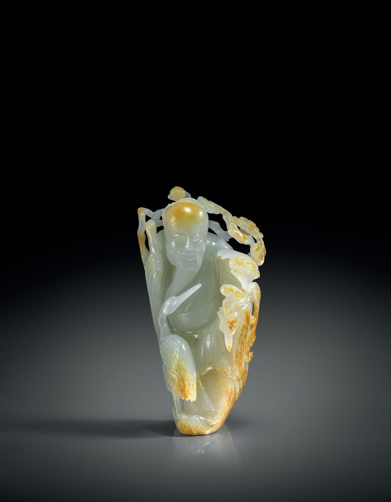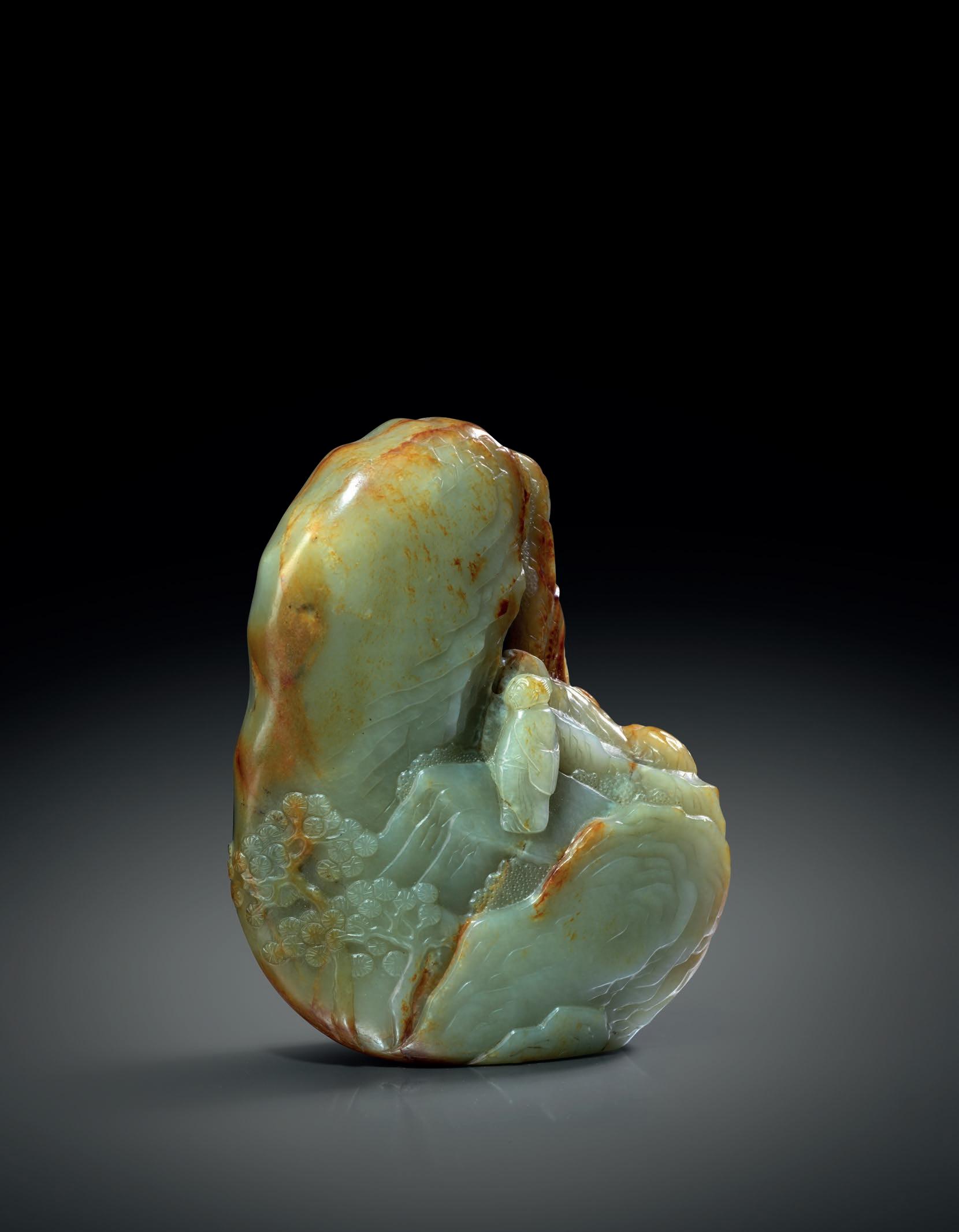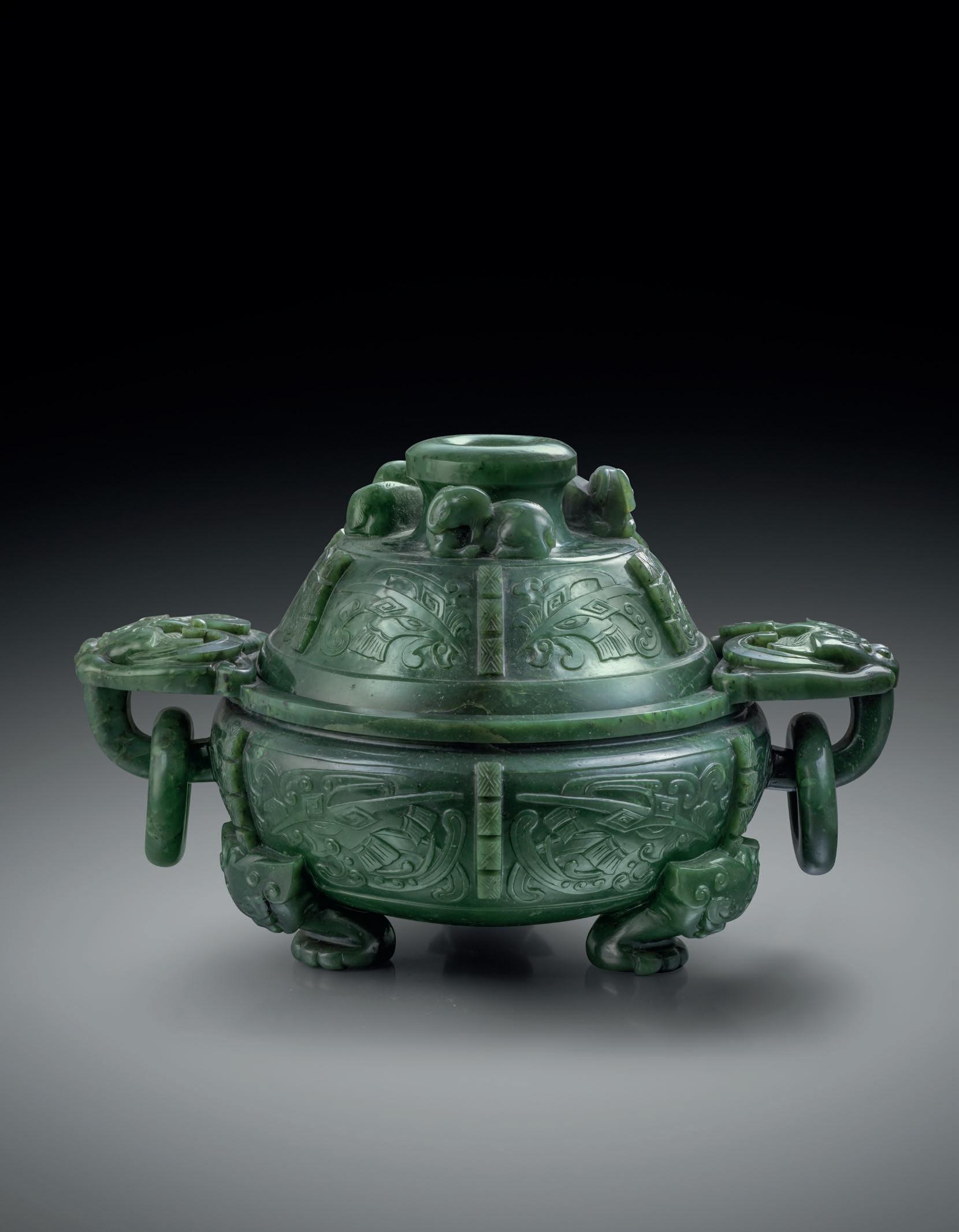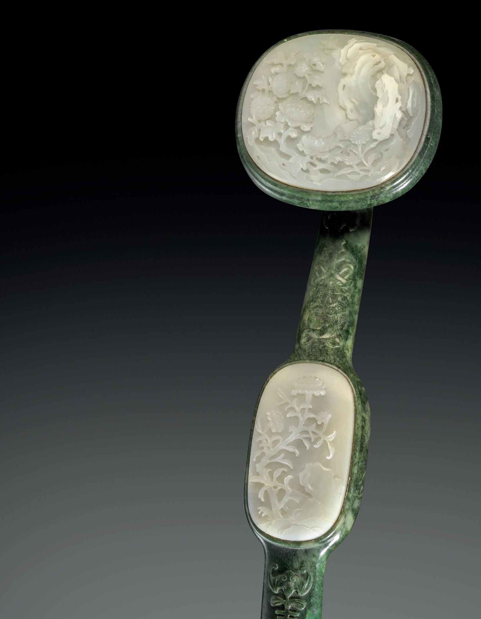 The most common substance assigned the name jade is the stone nephrite. It is composed of the minerals tremolite and actinolite and occurs mainly in areas near the central Asian cities of Khotan and Yarkand in Xinjiang province. This source of jade was in limited supply to Chinese carvers over the centuries, until in the 18th century the Qianlong Emperor (1736-95) conducted a series of successful military campaigns in Central Asia between 1755 and 1760. The Chinese Empire was thereby enlarged, including the area of present-day Xinjiang with its copious deposits of nephrite. This enabled carvers to work on massive pieces such as the huge jade mountain called Yu the Great Controls the Waters which weighs 5,300kg and is housed in the Forbidden City. Such exquisitely-worked carvings were often accompanied by inscriptions engraved on the back or sides. Inscriptions were also worked into decoration, such as that in the centre of the knop of each jar (lot 18) that says “long life”
