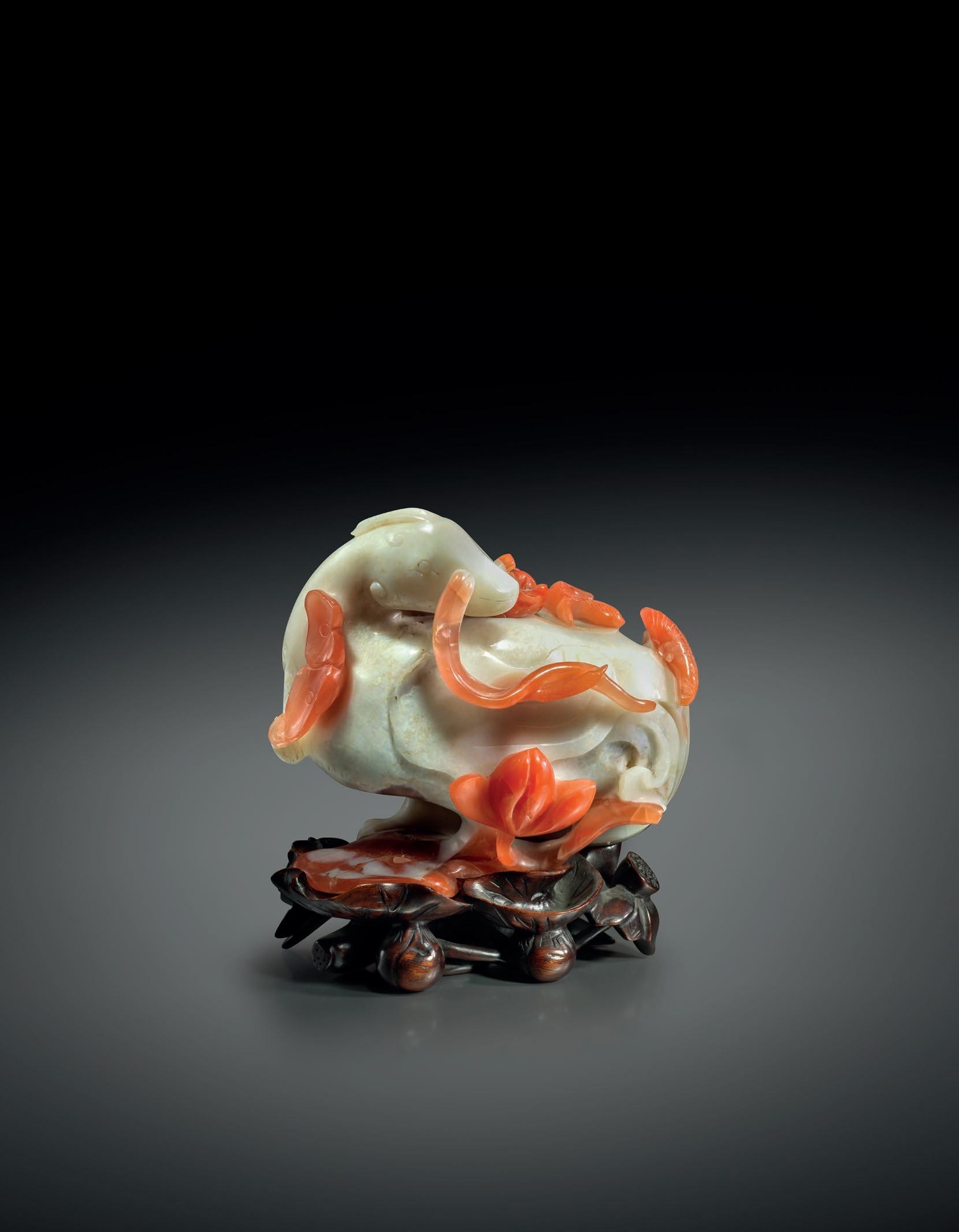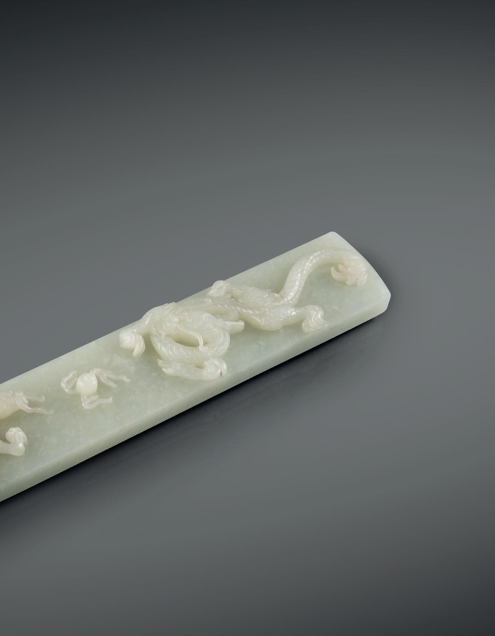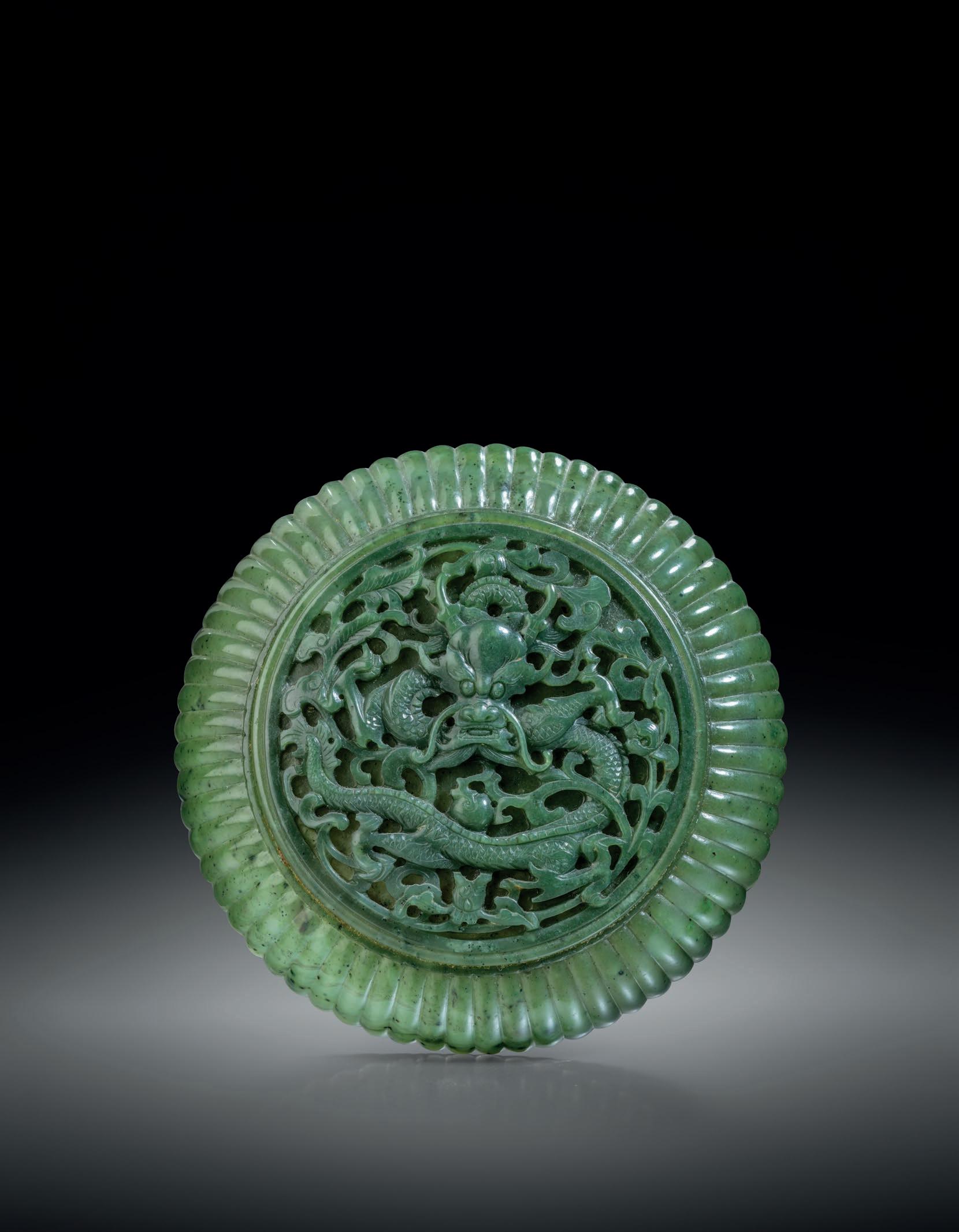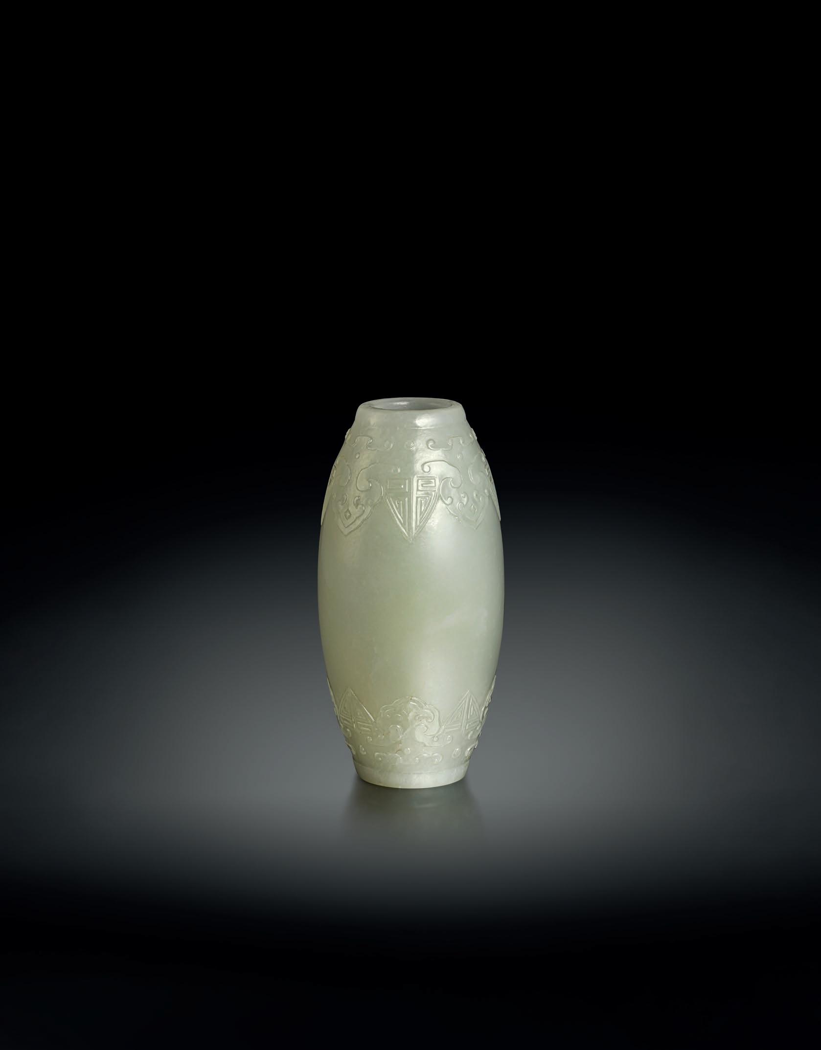 The most common substance assigned the name jade is the stone nephrite. It is composed of the minerals tremolite and actinolite and occurs mainly in areas near the central Asian cities of Khotan and Yarkand in Xinjiang province. This source of jade was in limited supply to Chinese carvers over the centuries, until in the 18th century the Qianlong Emperor (1736-95) conducted a series of successful military campaigns in Central Asia between 1755 and 1760. The Chinese Empire was thereby enlarged, including the area of present-day Xinjiang with its copious deposits of nephrite. This enabled carvers to work on massive pieces such as the huge jade mountain called Yu the Great Controls the Waters which weighs 5,300kg and is housed in the Forbidden City. Such exquisitely-worked carvings were often accompanied by inscriptions engraved on the back or sides. Inscriptions were also worked into decoration, such as that in the centre of the knop of each jar (lot 18) that says “long life”