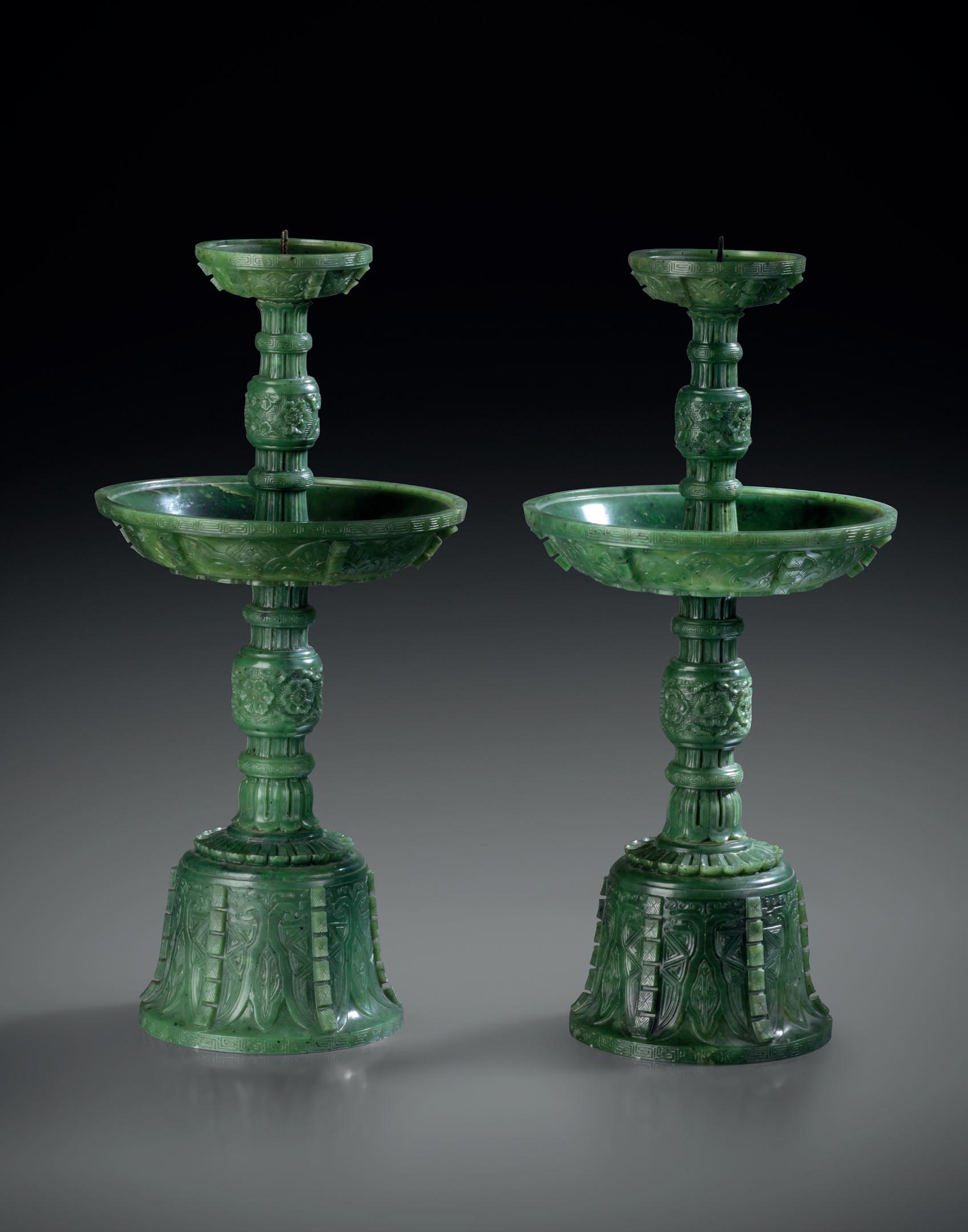Cf. The Complete Collection of Treasures of the Palace Museum, Jadeware (III), pp.83-84, no.71 for another Qianlong period altar set in spinach-green jade; see also p.82, no.70 for a related white jade set.