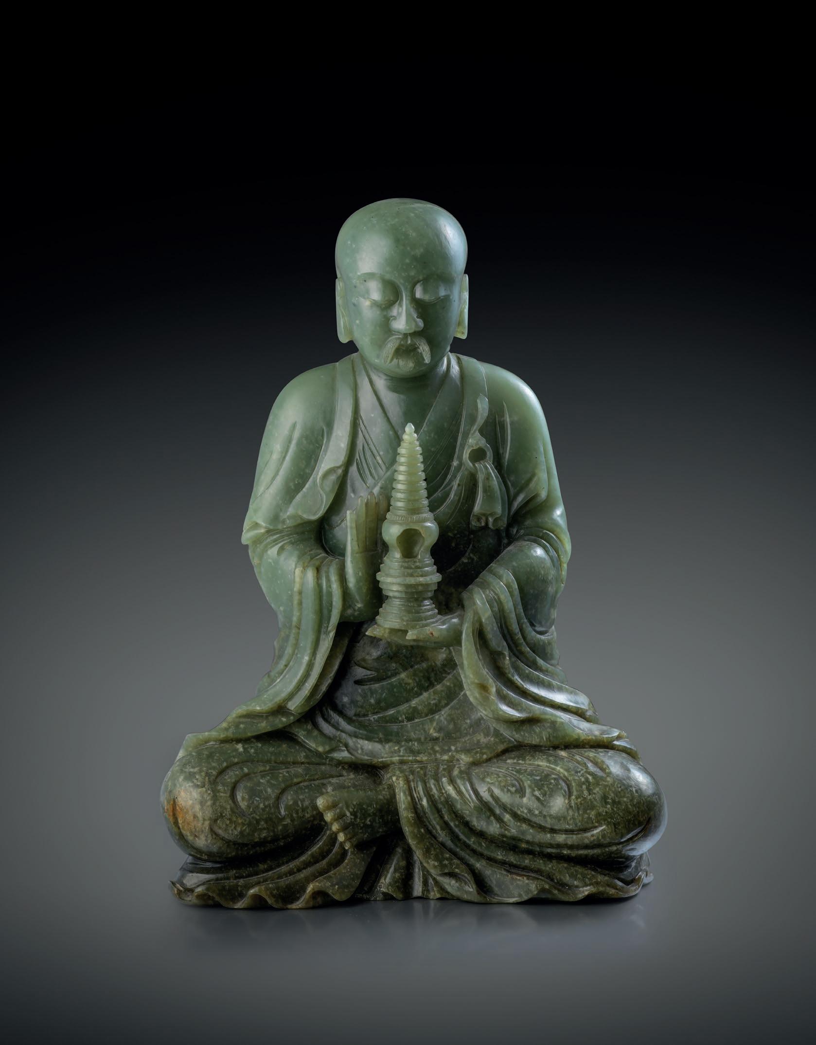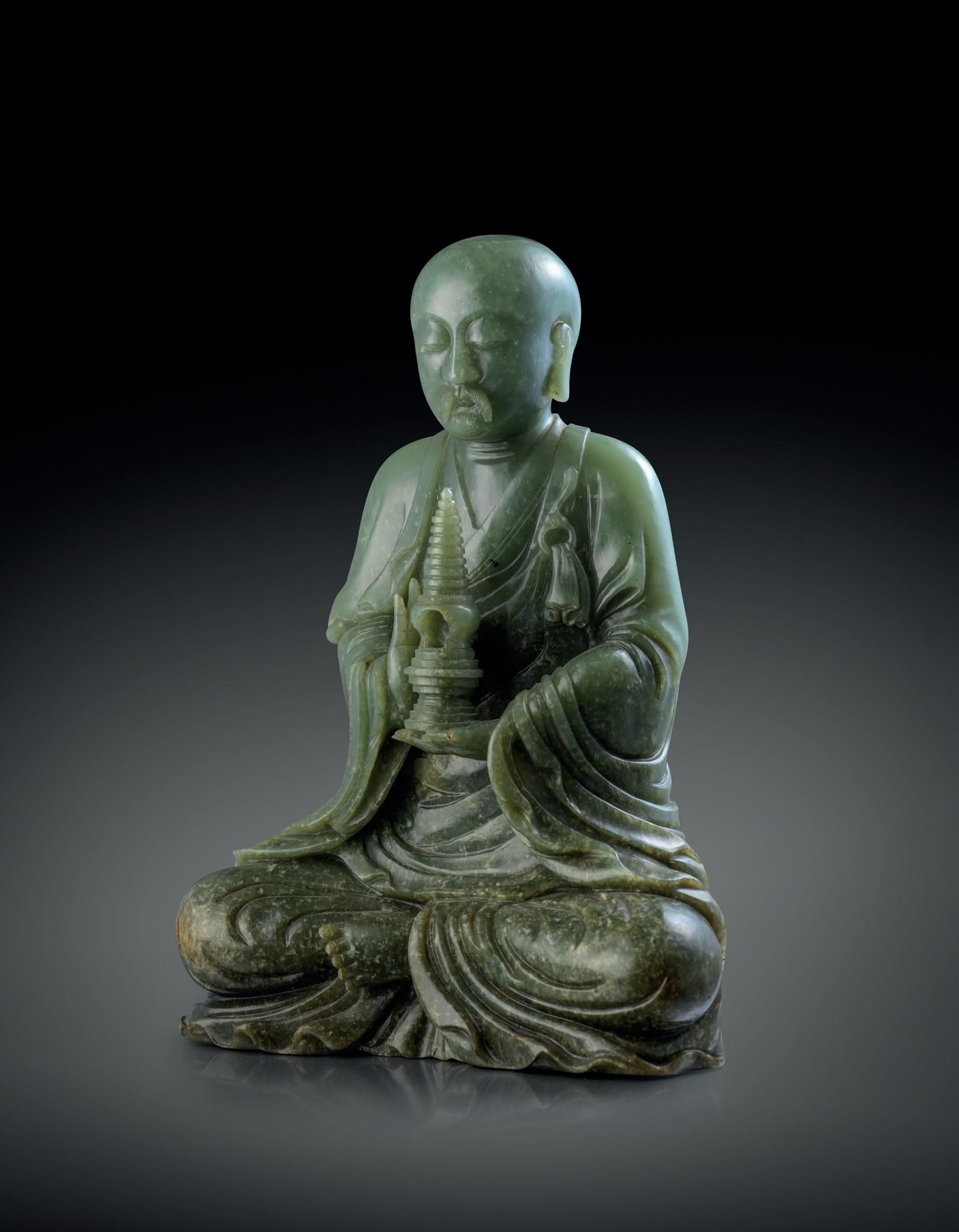 Cf. Catalogue of the International Exhibition of Chinese Art, 1935-6, no.2860 for a similar figure lent to the exhibition by Mr and Mrs Edward Sonnenschein; see also G Wills, Jade of the East, p.104, nos.63-64 and N Zhou, Ancient Jades in Man, Immortal and Buddha, p.309, nos.360-361 for further related examples; see also Asian Art I, 17th November 2010, lot 337 for a comparable spinach-green jade figure of Buddha of the same size previously sold in these rooms.