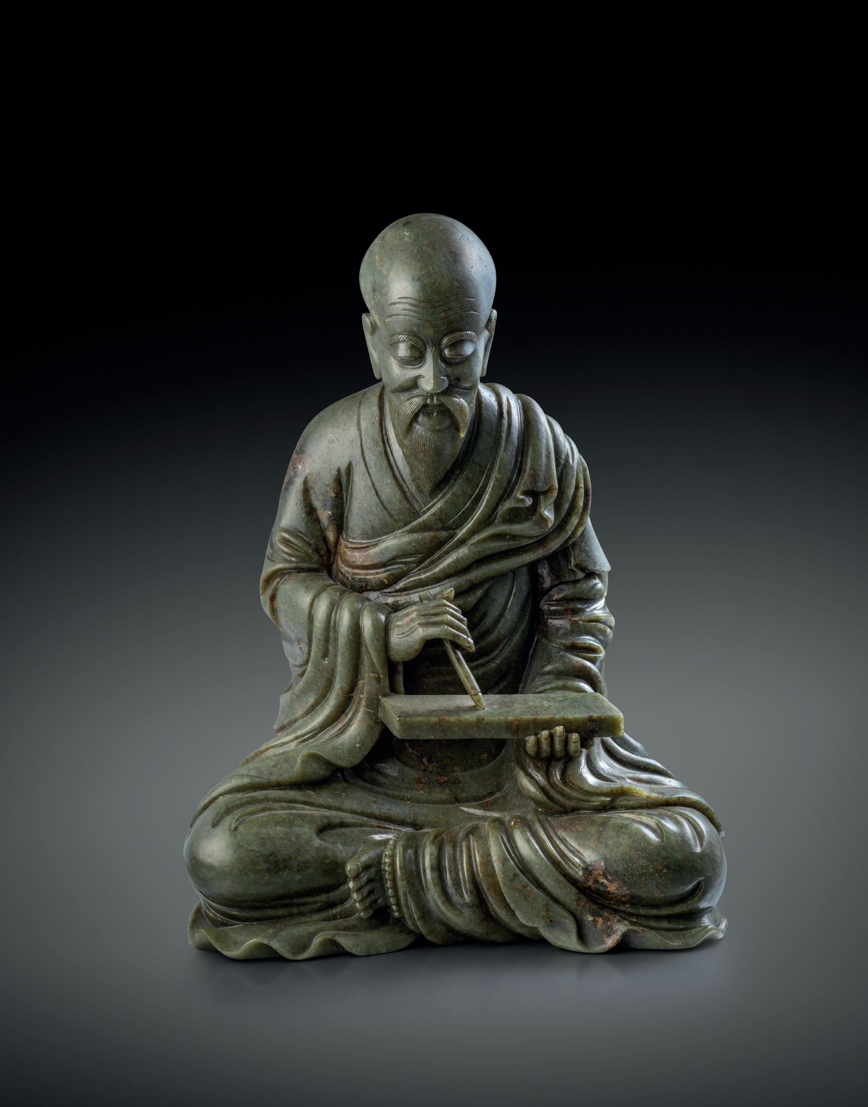 Depicted seated in dhyanasana holding a tablet in his left hand and a brush in his right, he wears long layered robes which fall in folds around his bare left foot, his well-defined face detailed with downcast eyes and wrinkles to his forehead, with finely incised hairs to his long beard and moustache, the deep green stone with brown and dark inclusions, 23.5cm.