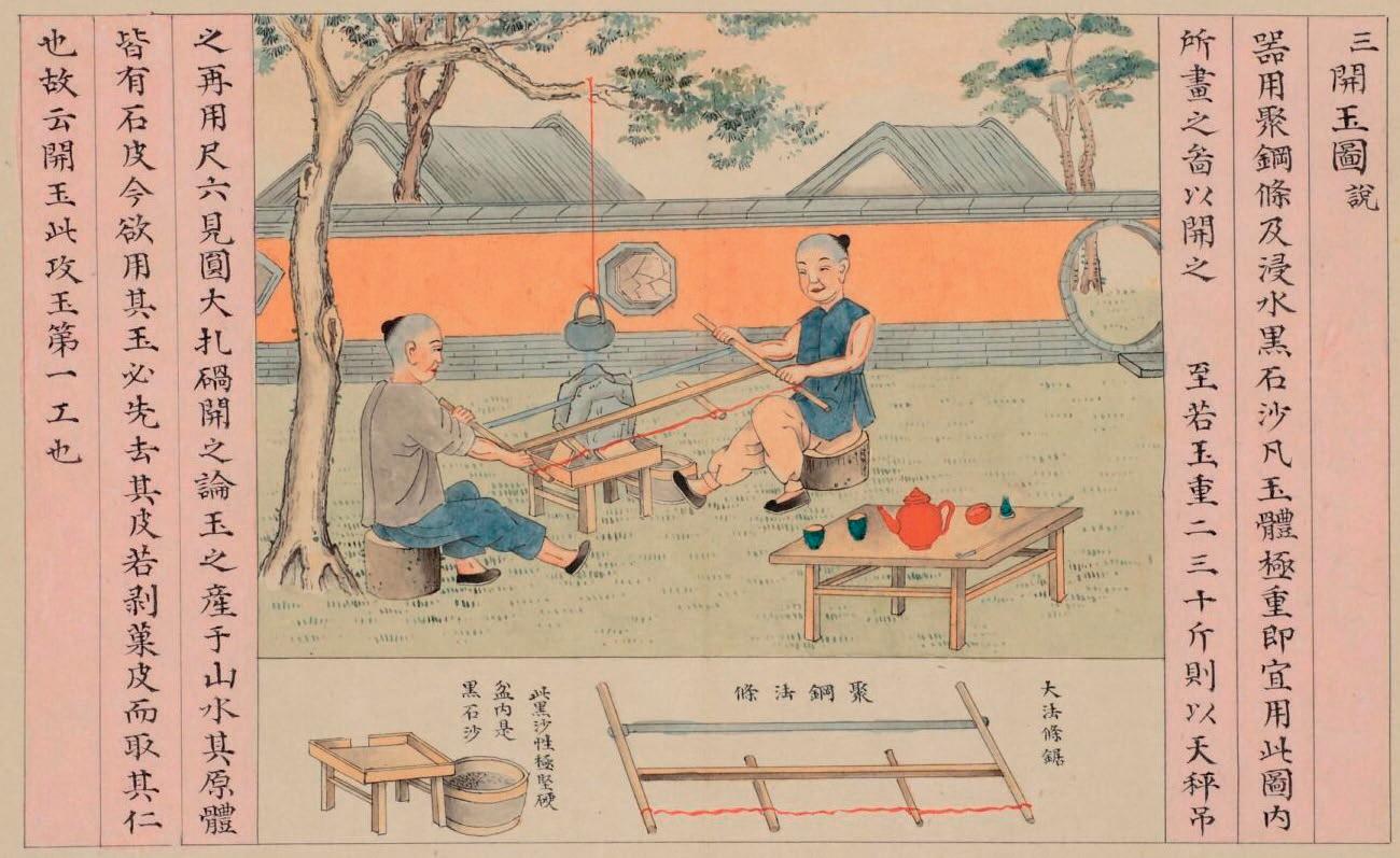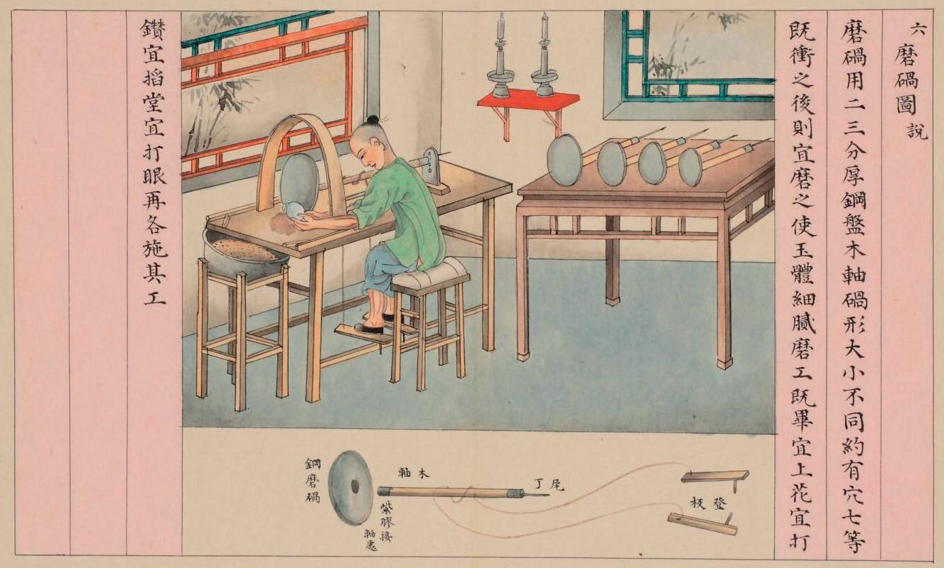 4000 年),可以將玉石以人力固定,讓工匠借輪軸之力 打磨治玉。砣機的出現促使了中國玉器工藝的蓬勃發展,製玉技術隨時代不斷演變和發展。除了砣機外,琢制玉器 用的解玉砂和研磨工具都是玉雕中的重要元素。早期的解玉砂是含大量比玉料硬的石英礦砂。隨著玉雕工藝水準逐 漸提高,解玉砂越見精煉,並加入其他天然磨料,如剛玉、石英和鑽石。在十八和十九世紀,工匠開始利用鑽石 鑽頭雕琢複雜精巧的紋飾, 清乾隆青灰玉雕香薰 (拍品編號 3),以及清乾隆白玉雕翠竹紋瓶(拍品編號 20), 都展現了當時精美絕倫的浮雕、鏤雕工藝。
