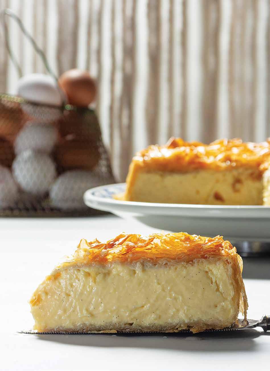 Σε ένα ταψί διαμέτρου 24 εκ. και ύψους 5-6 εκ. τοποθετούμε 5 φύλλα σταυρωτά, τα οποία έχουμε βουτυρώσει πολύ καλά. Τοποθετούμε άλλο ένα στο κέντρο το οποίο έχουμε τσαλακώσει. Αδειάζουμε την κρέμα ζεστή και διπλώνουμε τα φύλλα που εξέχουν προς τα μέσα βουτυρώνοντάς τα ενδιάμεσα. Τσαλακώνουμε άλλα δύο φύλλα τα οποία τοποθετούμε στην επιφάνεια και τα βουτυρώνουμε κι αυτά. Ψήνουμε σε προθερμασμένο φούρνο στους 160°C για 50-60 λεπτά. Αφήνουμε να κρυώσει.