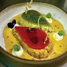 σελινόριζας, chips λαχανίδας και σάλτσα λεβάντας, καθώς