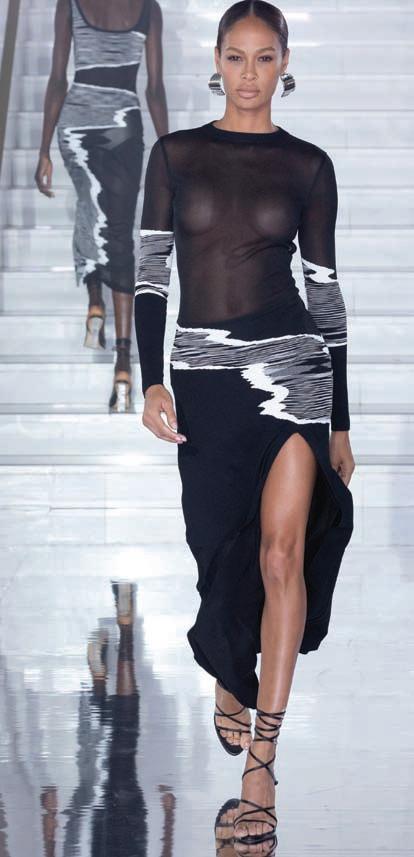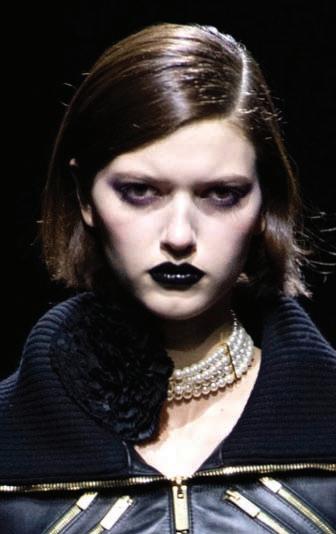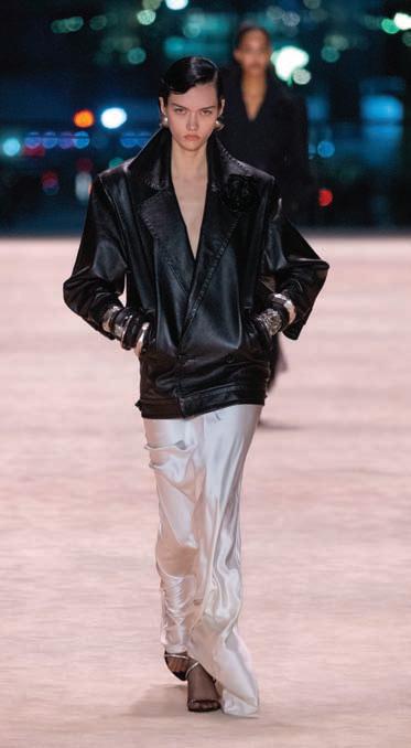 του 2022. Σω στά, ό,τι φορούσαμε στα 00s επιστρέφει, χωρίς αμφιβολία επηρεασμένο από τα απίστευτα μακιγιάζ ματιών της σειράς Euphoria και της «Night luxe» αισθητικής του TikTok. Οι πασαρέλες ακολούθησαν τη μανία, αγκαλιάζοντας το trend είτε με πολύ artistic βλέφαρα όπως μας έδειξαν οι οίκοι Simone Rocha και Gucci, είτε δί νοντας λίγο φως στα μάτια με λαμπερές ασημένιες σκιές όπως ο Dior Sl EE k Μά λλ ί ά Το αγαπημένο στιλ μαλλιών των catwalks δεν έχει ξεθωριάσει ακόμα από τις επικρατέστερες τάσεις, καθώς οι σχεδιαστές επέλεξαν το γυαλισμένο, sleek χτένισμα και για φέτος τον χειμώνα. Ο Prada εμφάνισε όλα του τα μοντέλα με ένα αυστηρά τραβηγμένοπρος τα πίσω hairstyle, που γυάλιζε έντονα κάτω από τα φώτα της πασαρέ λας. Αρκετοί ακόμα οίκοι όπως οι Fendi και Jil Sander κράτησαν μια λίγο πιο ανάλαφρη προσέγγιση του συγκε κριμένου look, αναδεικνύοντας την φυσική υφή των μαλλιών. Σκοτε ί ν ο & Σ βη ΣΜε νο Τα «μουτζουρωμένα» μάτια και τα τολμη ρά, σκούρα χείλη αντανακλούν τη βασική διάθεση των φετινών makeup trends. Το συγκεκριμένο makeup look έχει κάτι από την grunge αισθητική των 90s, με το σβησμένο εφέ που αποκτά το μακιγιάζ ύστερα από μια έντονη νύχτα πάρτι. Ο Blumarine συνδύασε glossy μαύρα κραγιόν μαζί με σκούρες μοβ σκιές στα μάτια, ο Versace επέμεινε σε ολόμαυρα σβησμένα eye looks, ενώ οι Lanvin και Saint Laurent έπαιξαν με navy blue αποχρώσεις. Η επιδερμίδα μένει συνήθως φυσική και λαμπερή.