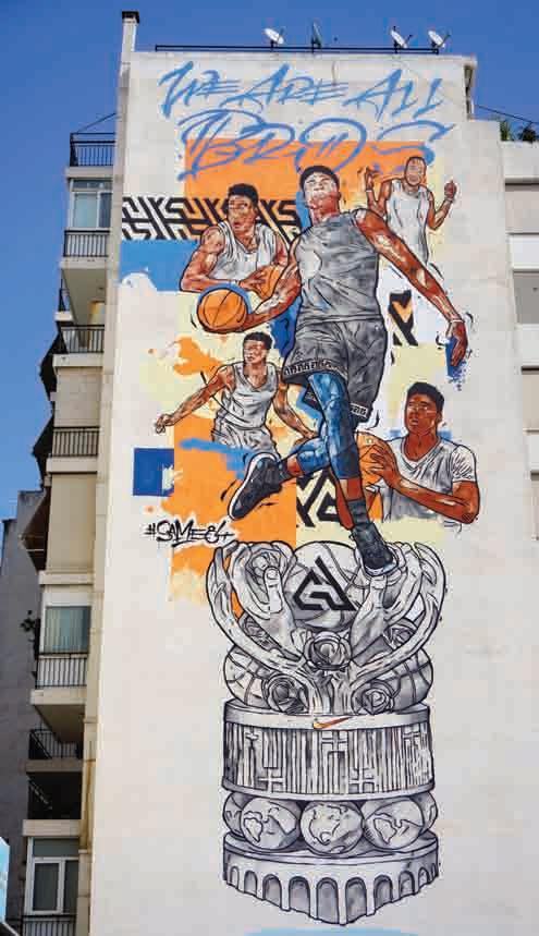 γήπεδο του Τρί τωνα που έκαναν τα πρώτα τους βήματα. Ο street artist Same84, σε συνεργασία με τη Νike, φιλοτέχνησε το 2019 την τοι χογραφία με τον Γιάννη Αντετοκούνμπο να «πετάει» στον αέρα για να καρφώσει, ενώ οι Θανάσης, Κώστας, Φράνσις και Άλεξ βρίσκονται γύρω του λίγο πριν την έναρξη του Παγκοσμίου Κυπέλλου μπά σκετ. «We are all bros», άλλωστε.
