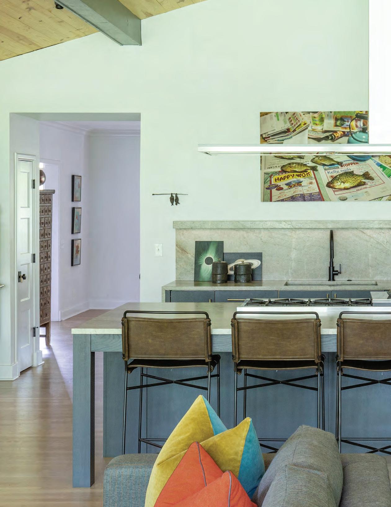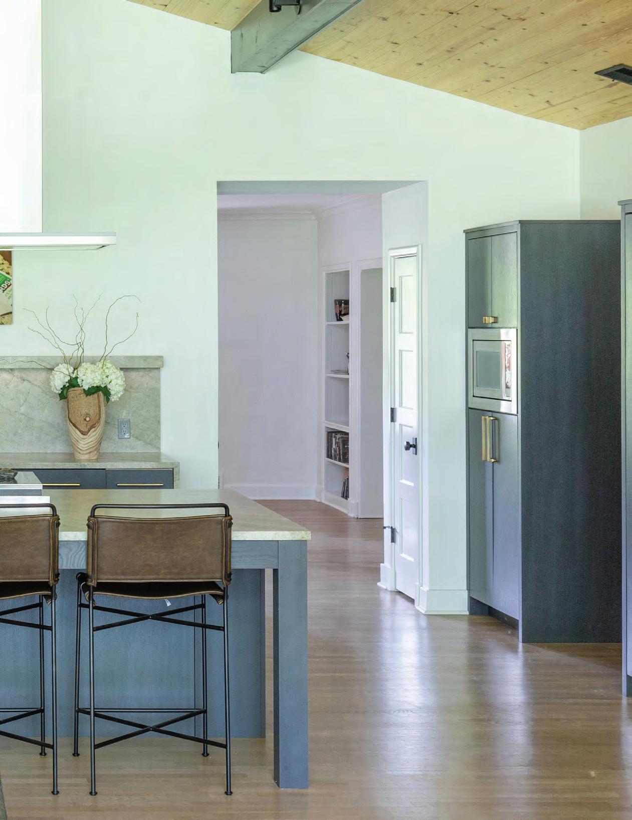 Wynn was adamant about replacing the home’s tiny, galley-style kitchen with one that better suited his lifestyle. All of his children and grandchildren live locally and his place is frequently full of family members. The new addition is the hub of the home, kitchen/dining area/casual living space all in one, with plenty of room for all the relatives. A vaulted ceiling in stained tongue-andgroove wood with exposed beams ties the large area together.