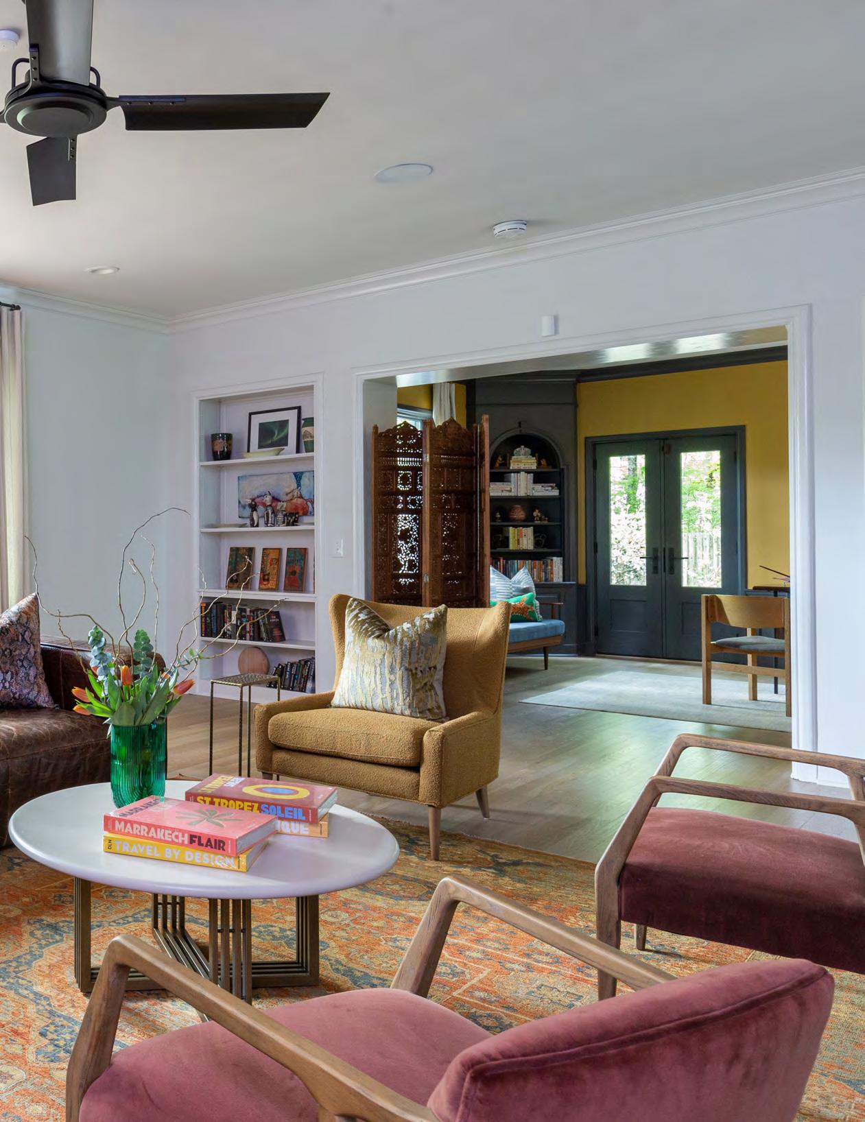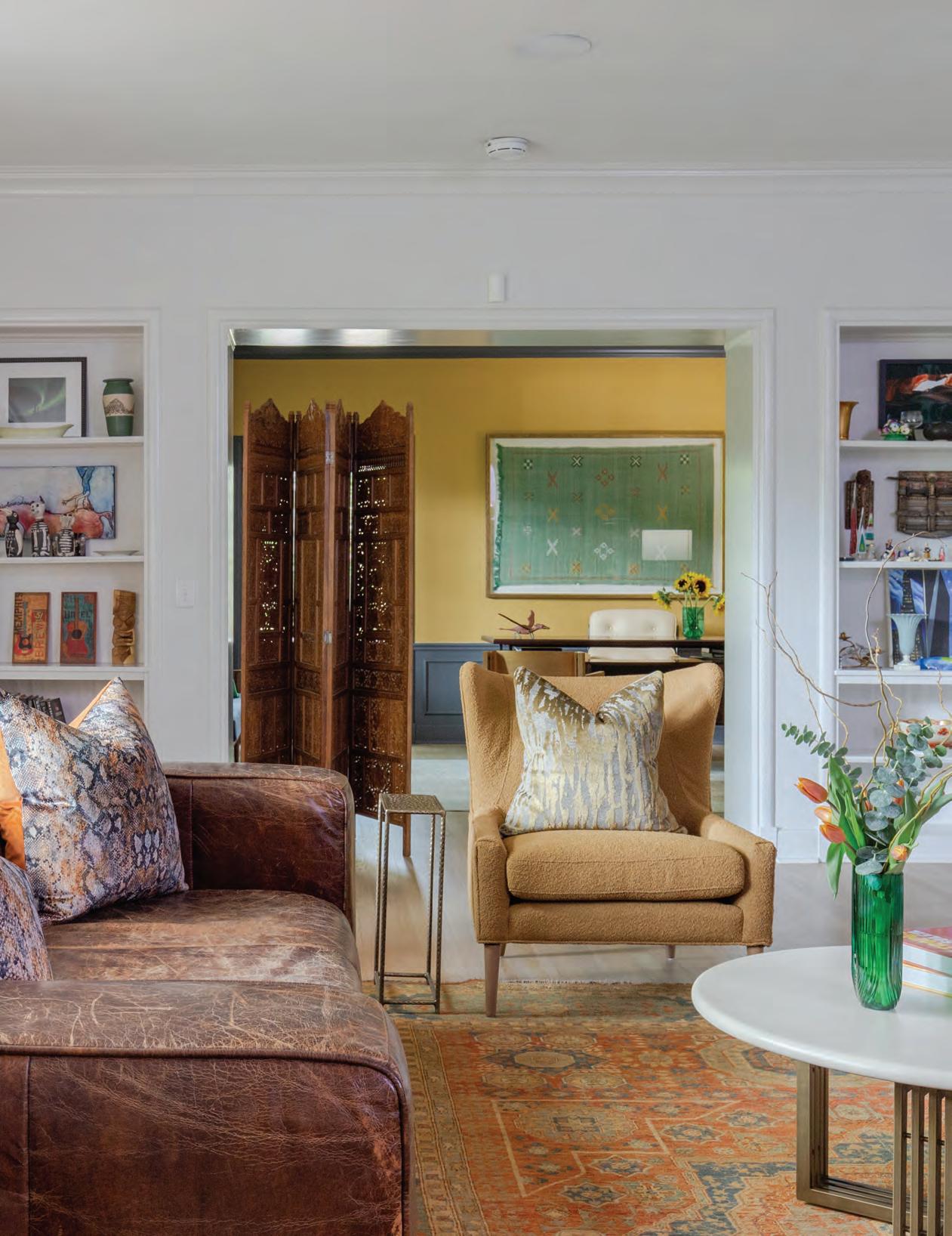 Justoff the living room, the original dining room has been repurposed into Wynn’s home office. The homeowner requested color in the space, and McAdams delivered, choosing a warm golden yellow for the walls, accented by a saturated charcoal hue on the wainscoting, mouldings and two built-in corner cabinets, features of the home’s original architecture. A lowbacked mid-century Danish sofa with exposed wood frame and legs, and a vintage desk look right at home alongside Wynn’s many books and eclectic art.