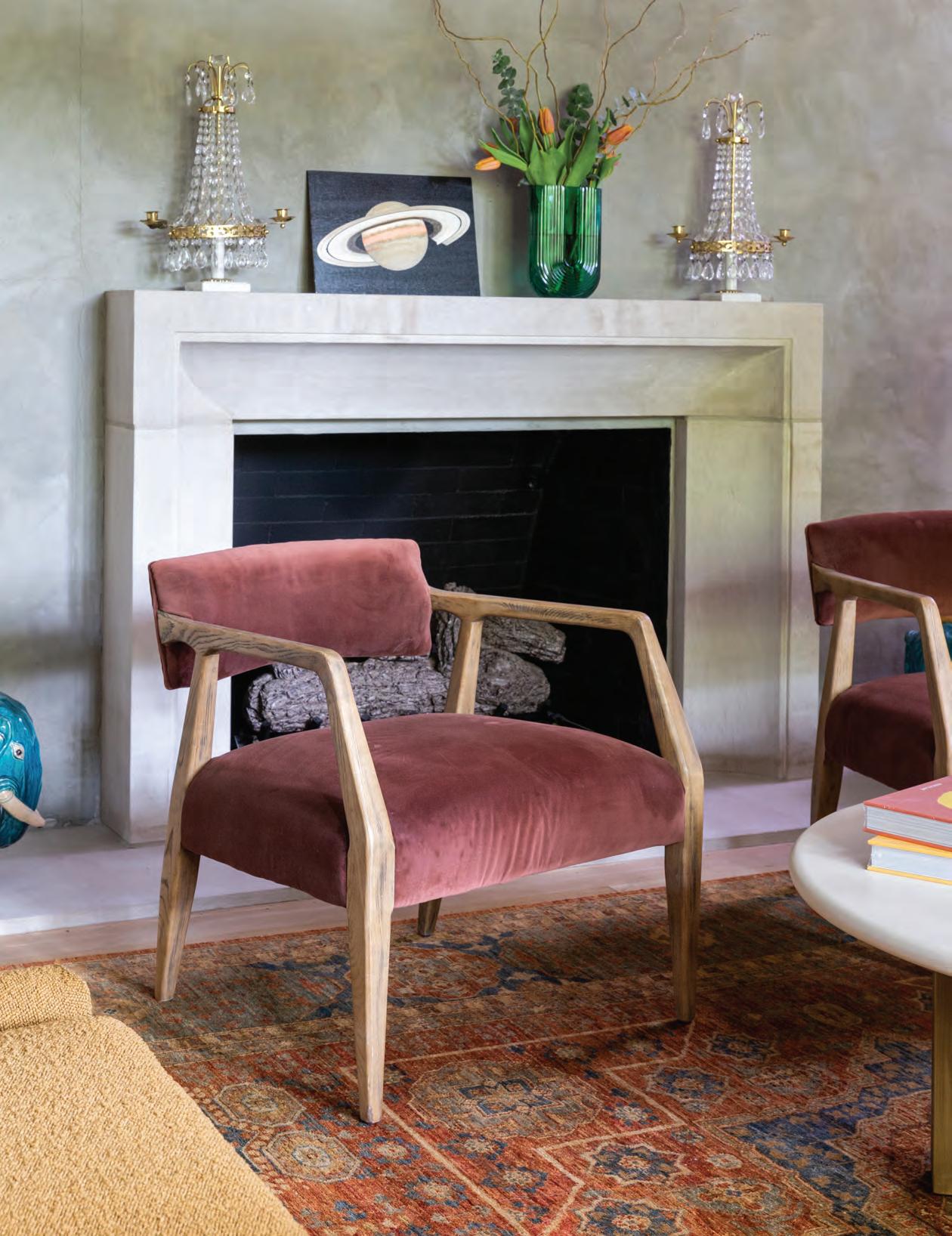 Just such a piece, a weathered brown leather sofa, anchors the home’s living room. McAdams added more seating in the generously sized space—a pair of Four Hands armchairs upholstered in soft aubergine velvet and twin stylized wingback chairs in olive boucle—along with a round marbletop coffee table.