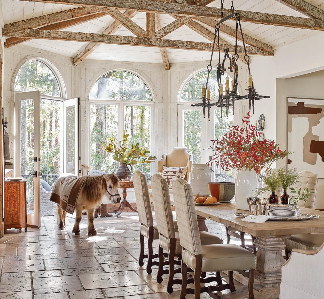 Sunny, a miniature horse, makes an entrance in a breakfast room, where an extra long table o ers the perfect spot for both meals and game nights. See “Going Country” at atlantahomesmag.com