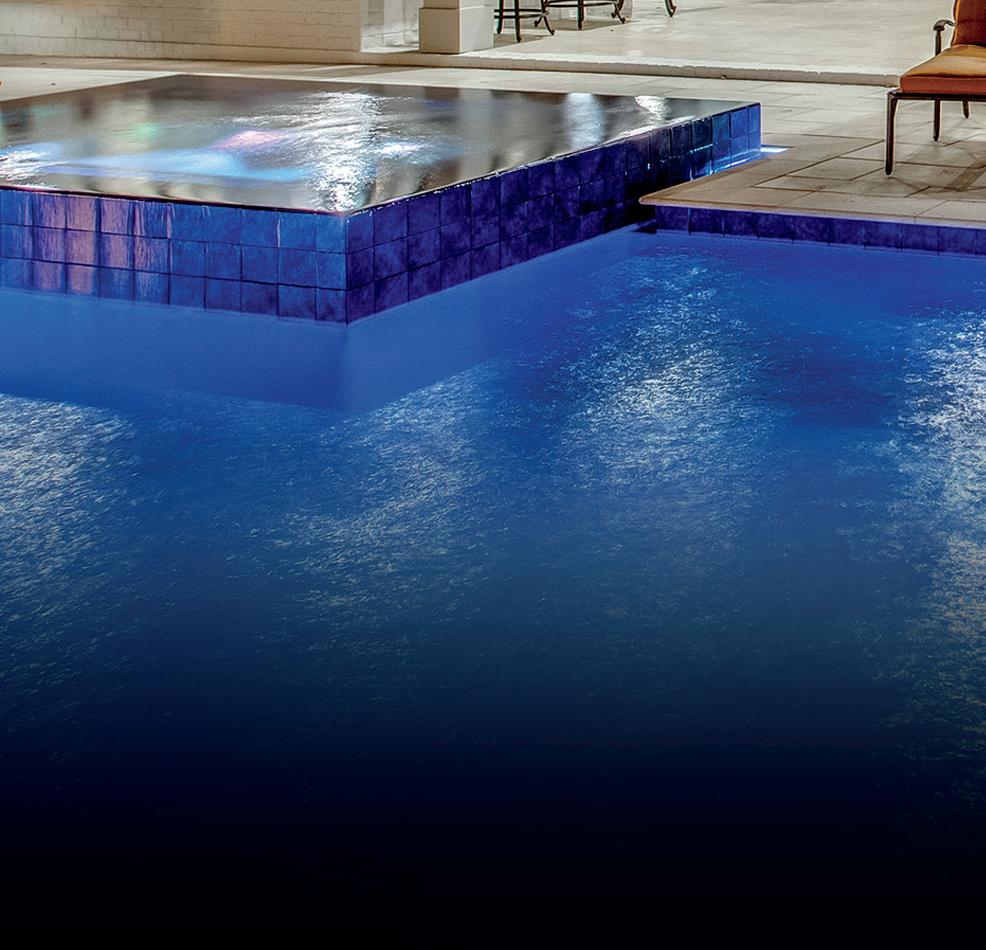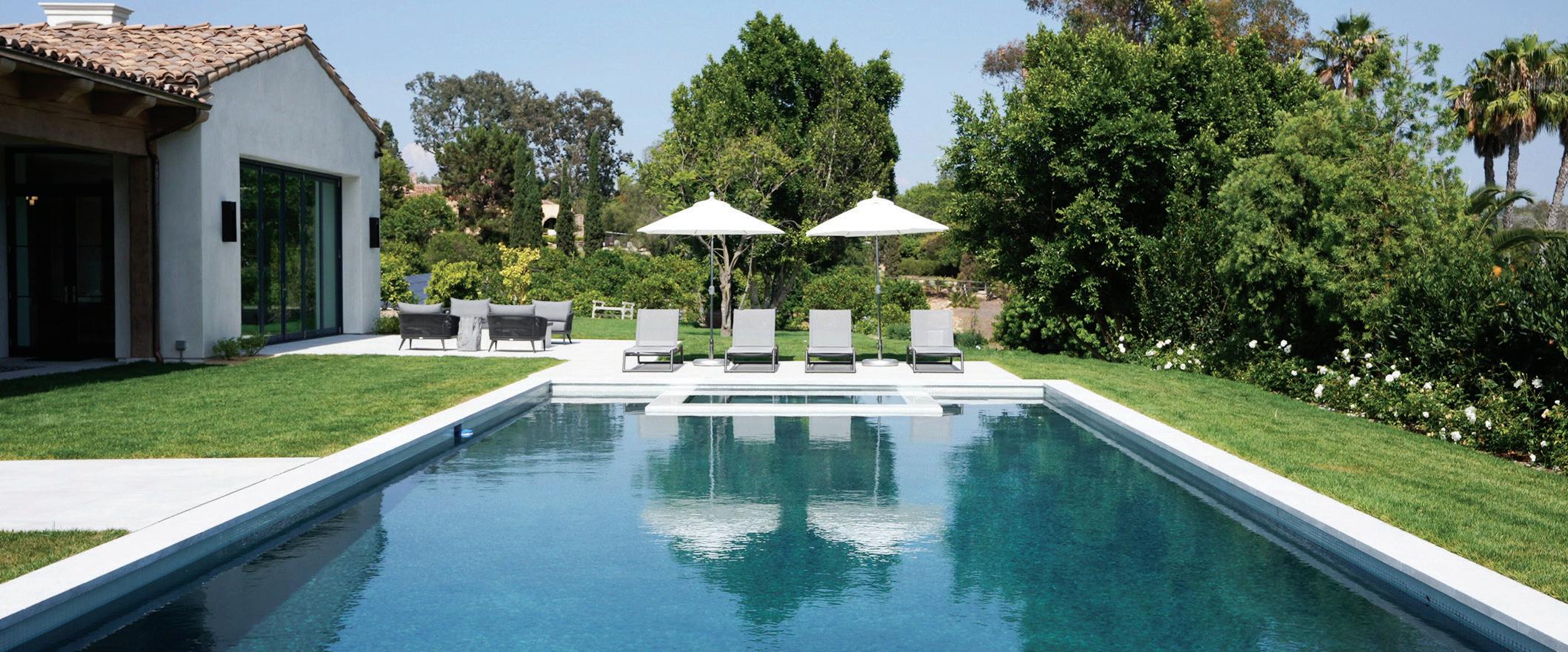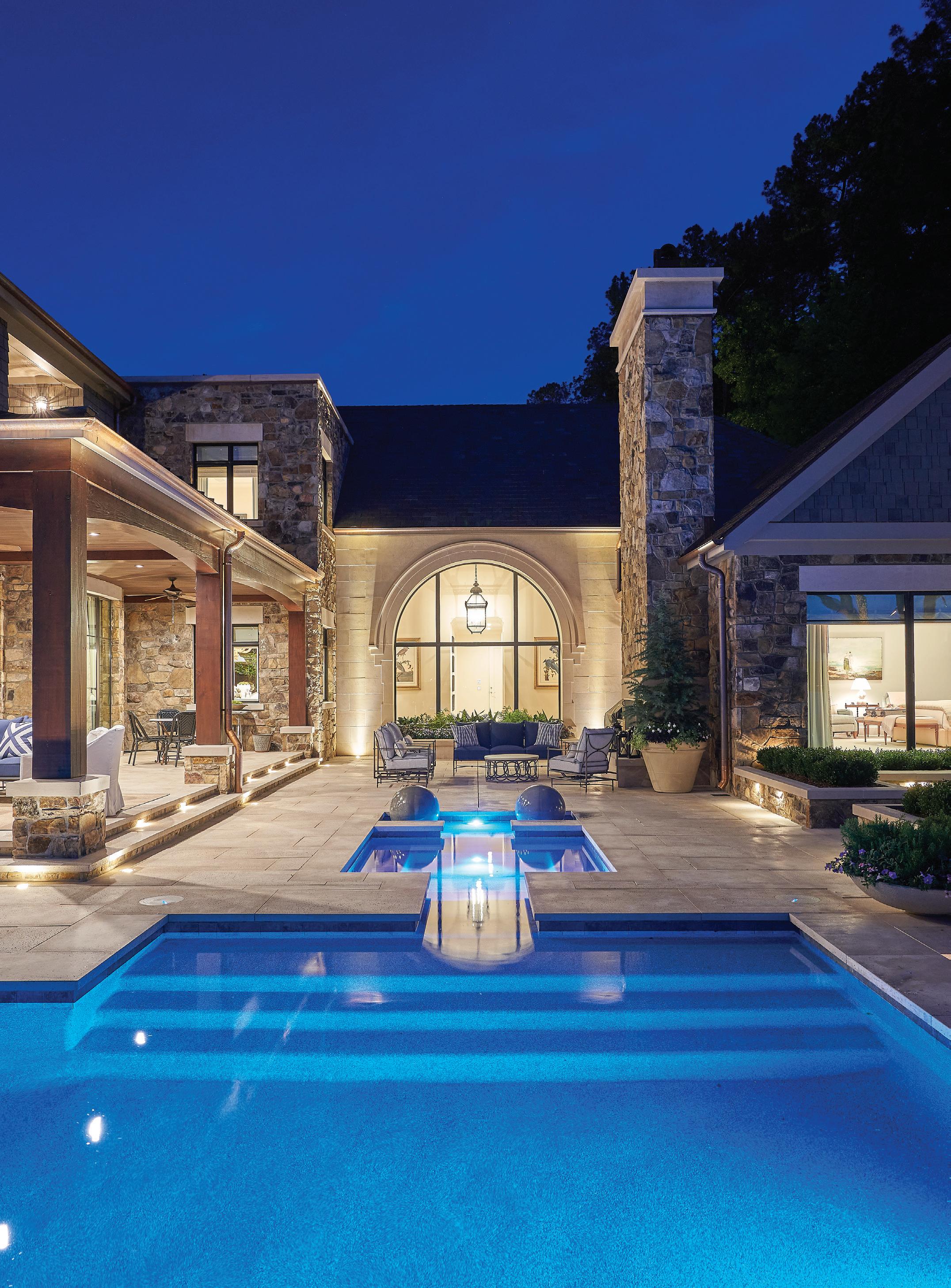 A round cast stone table anchors a pool lounge, while upholstered seating in lightweight fabric tempts swimmers to take a break. See “California Cool” at atlantahomesmag.com