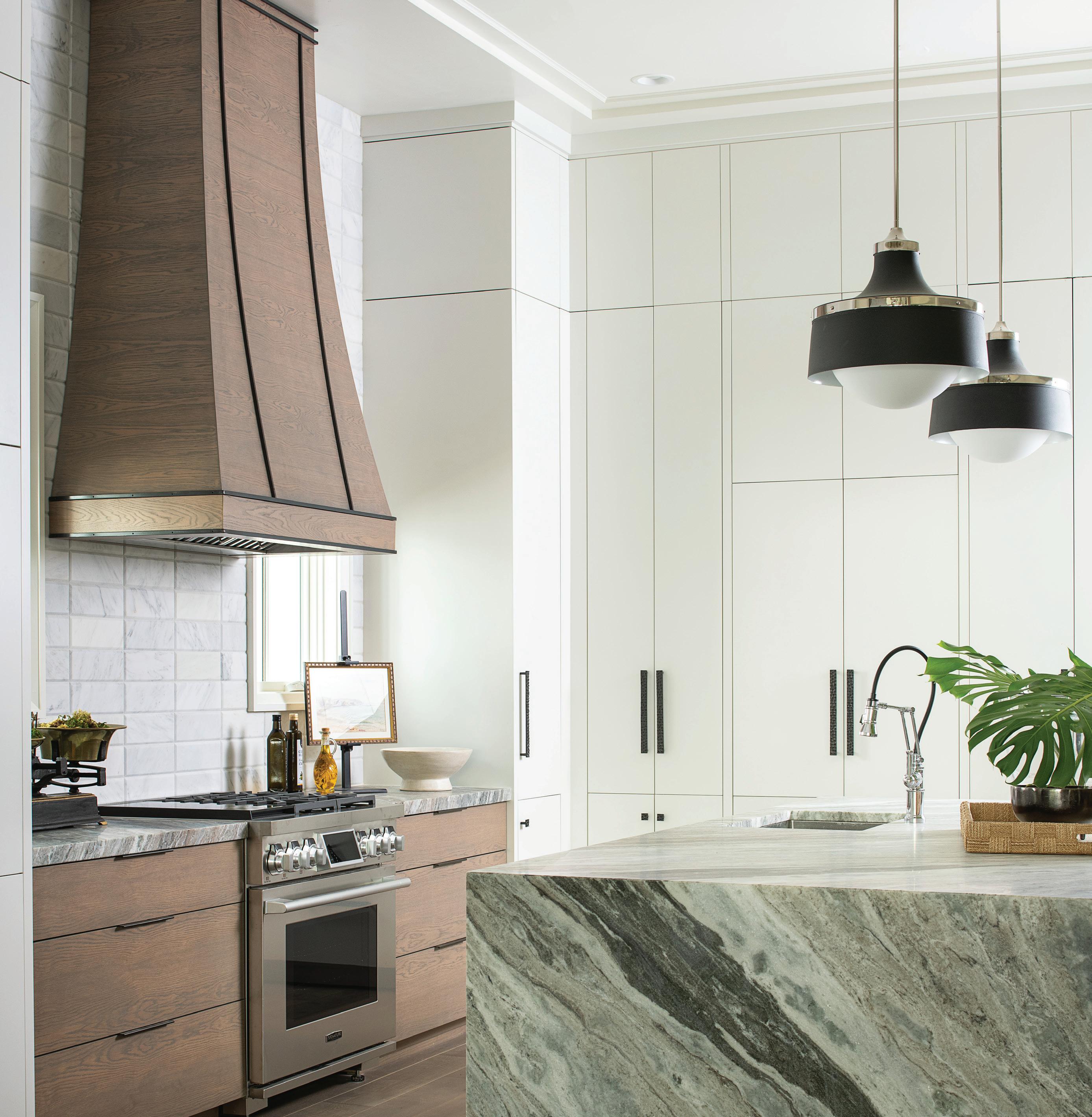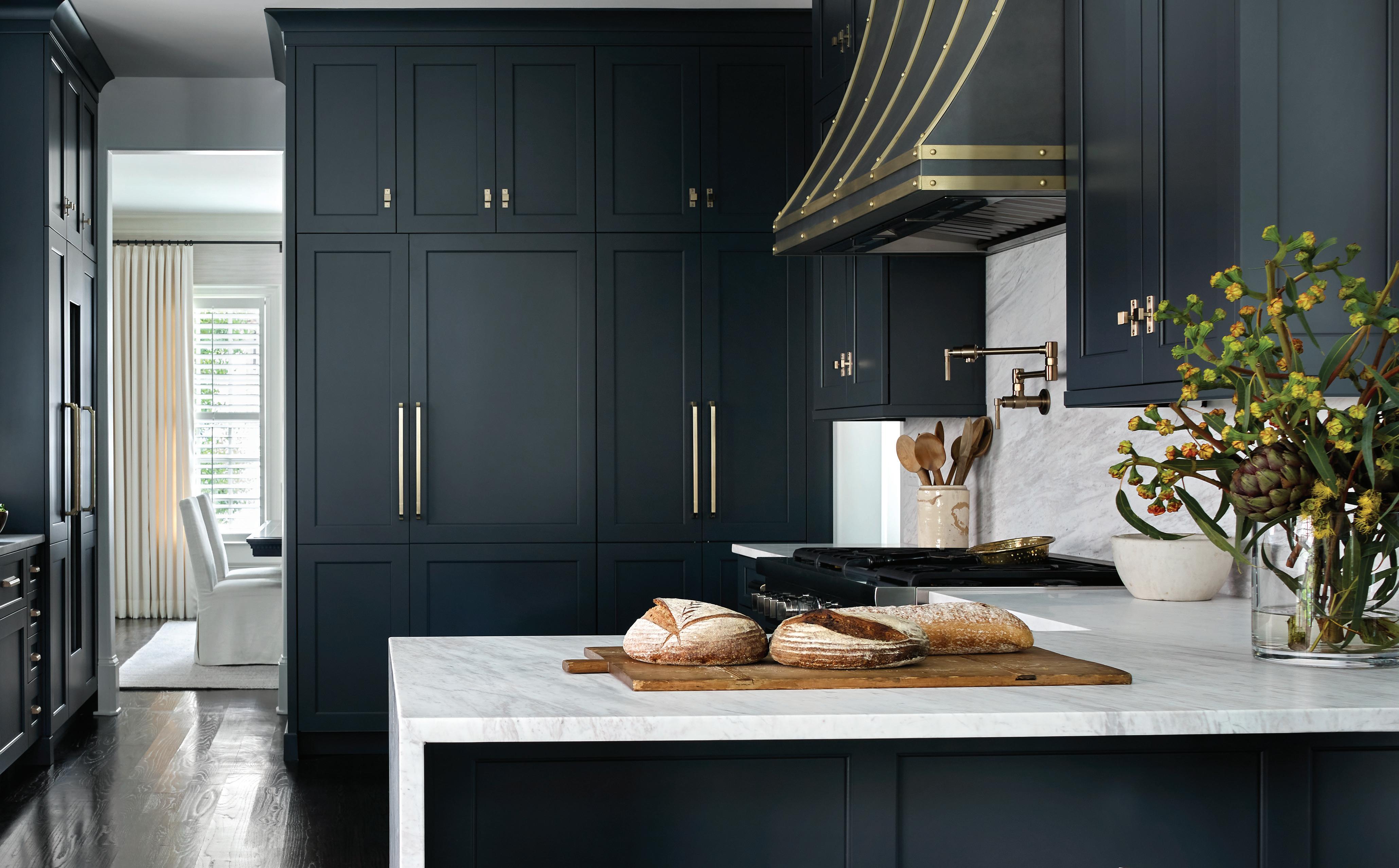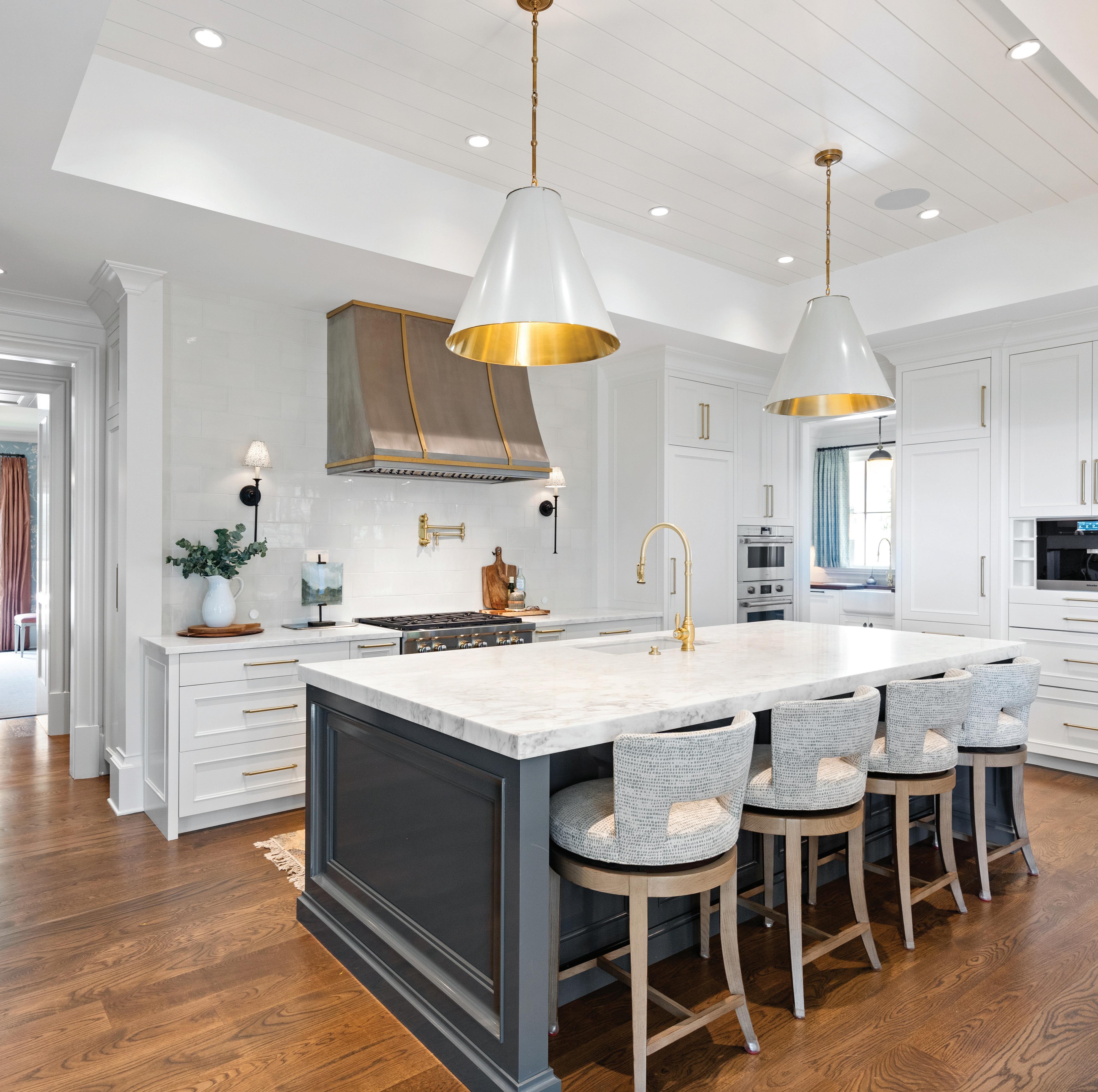 Inside a kitchen, the inspiration for the blue cabinets came from the swirls of blue and gray in the Calacatta Lucina marble countertops and backsplash. See “With a Twist” at atlantahomesmag.com
