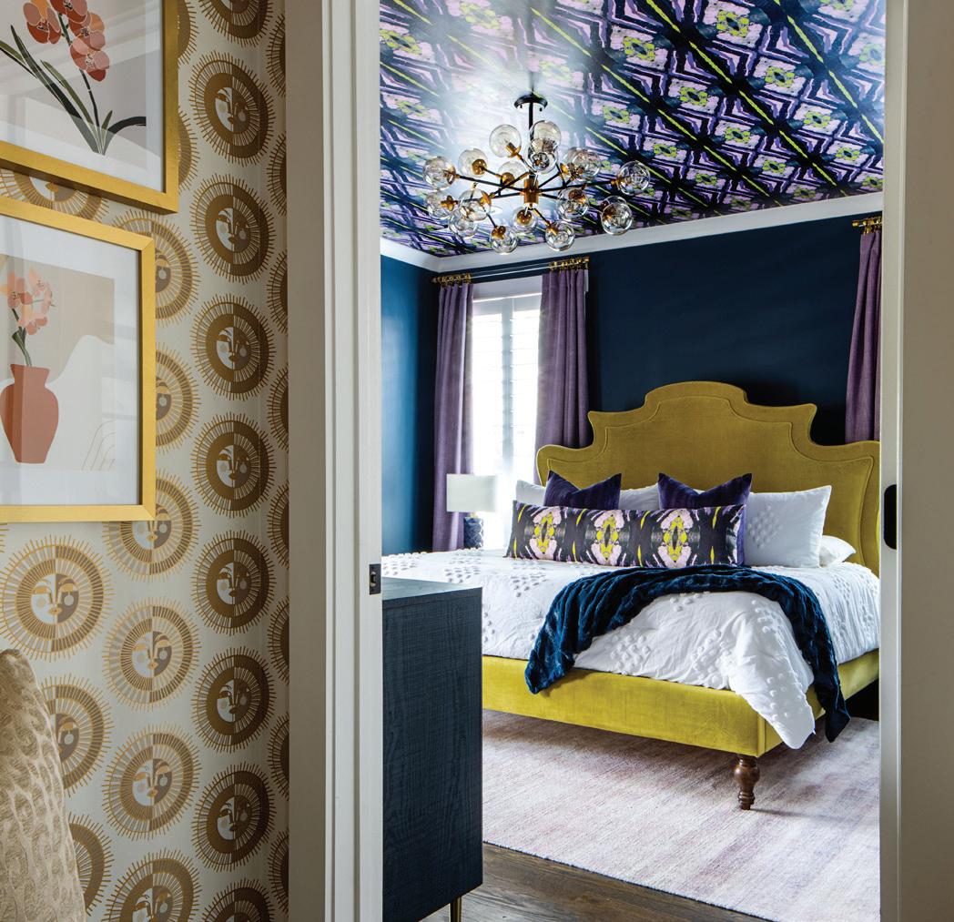 Playful pops of pattern and color abound in a bedroom that’s both moody and sophisticated.