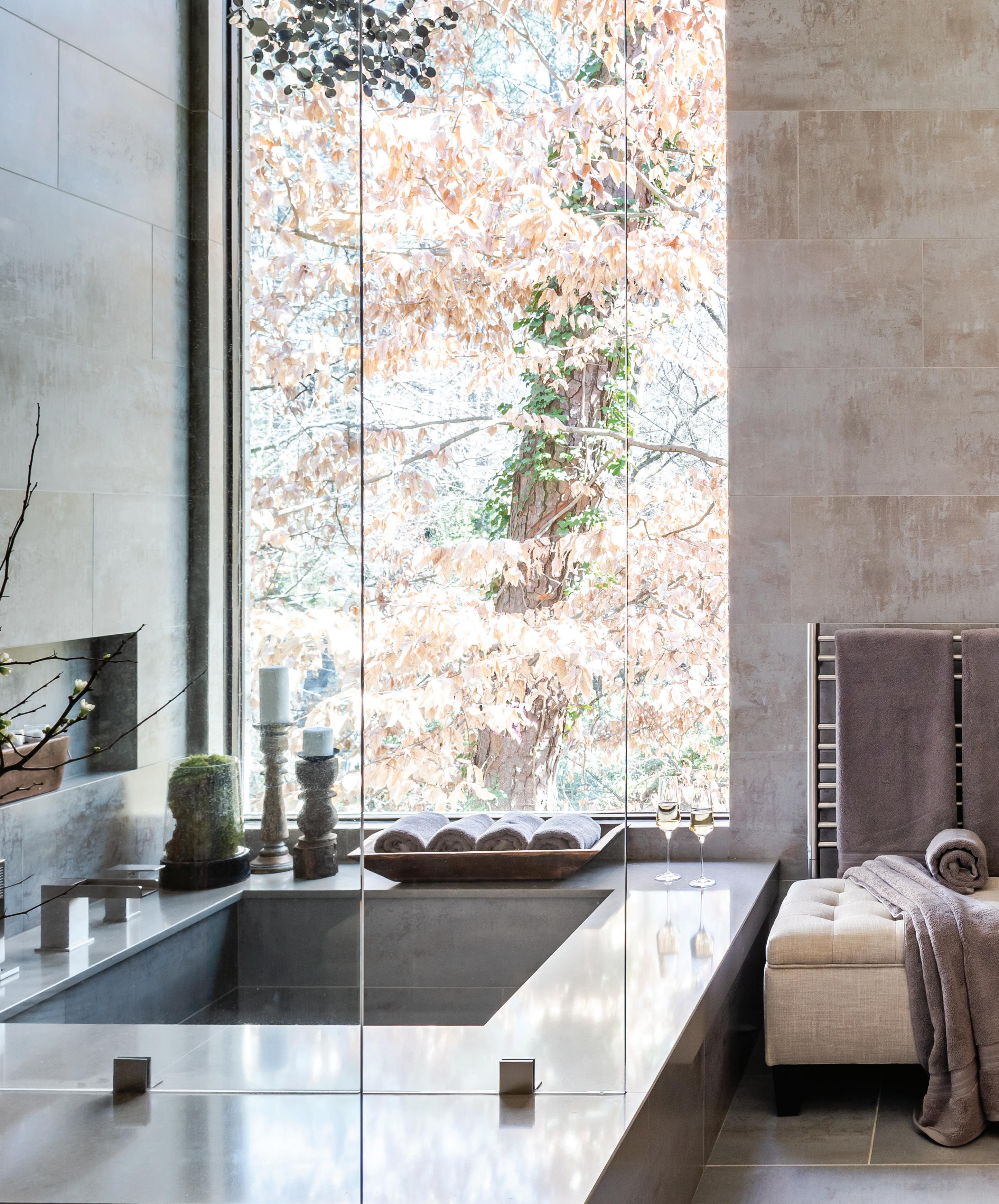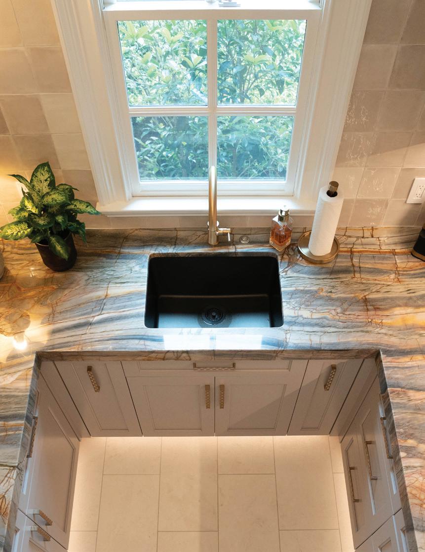 open kitchen, an arched window behind the stove serves as a way for homeowners to soak up the light and views as the seasons change. The openness of those spaces contrasts with the privacy of other areas, such as the fireside living room and library. Upon entering the home, guests find the dining room situated off the foyer, which then flows to the kitchen and its accompanying scullery and pantry for functionality and storage.