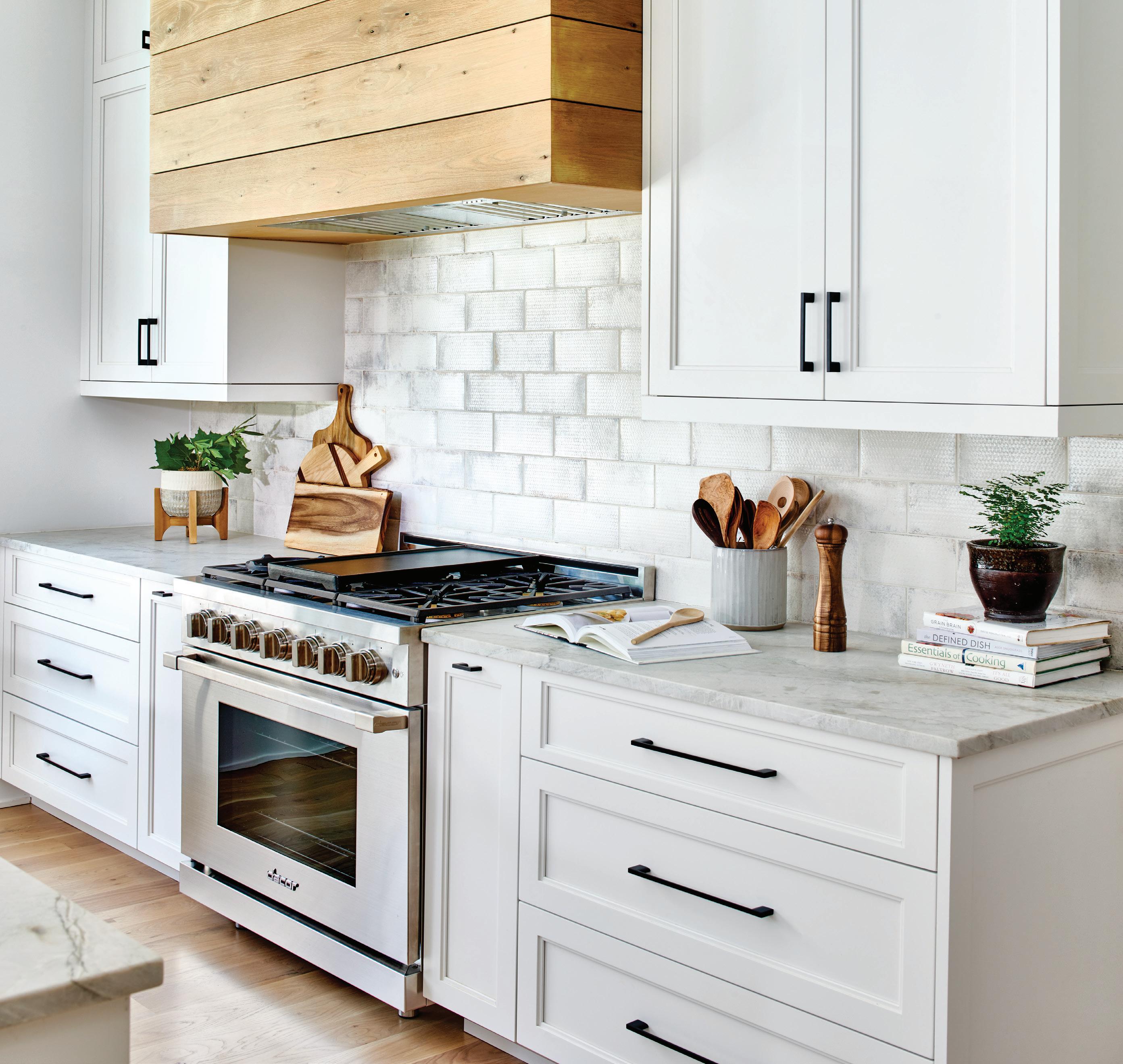 A stucco exterior and simplified interior trim present timeless, clean-lined design. Traditional fittings blend with updated finishes, such as solid French white oak flooring, custom cabinets by Kingdom Woodworks, Wolf and Sub-Zero appliances, and O’Neil Ruppel plumbing fixtures through Renaissance Tile & Bath.