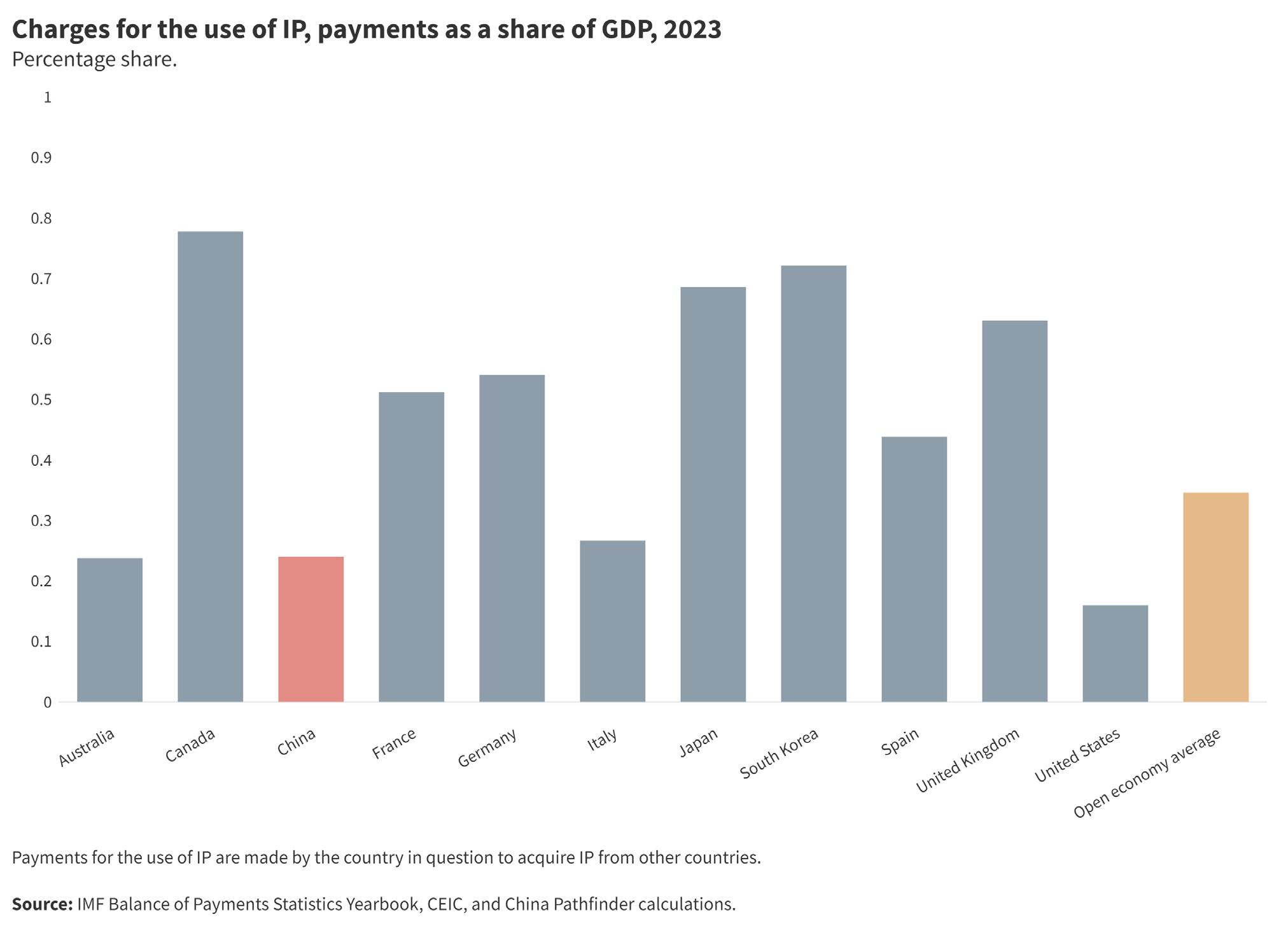 The China Pathfinder indicators also illustrate how the flows of goods, services, and capital are becoming increasingly strained. China’s portfolio and direct investment benchmark indicators both declined in 2023 after making moderate progress since 2010. Services trade intensity declined, and the services trade restrictiveness index for China worsened slightly. Intellectual property (IP) protection remains a large issue for firms operating in China, reducing incentives for direct investment. Unequal treatment of foreign firms and other problematic market competition dynamics compound these concerns. Overall, the only flow left redeeming the Chinese economy is trade in goods intensity, which saw another increase, consistent with its long-term trend. This is emblematic of an economy that is overly reliant on exports as the last remaining source of reliable growth. At the same time, Germany and Japan within our comparison group have also variously leaned on exports during their economic history; neither has concurrently faced comparable pressures across other financial and trade flows.