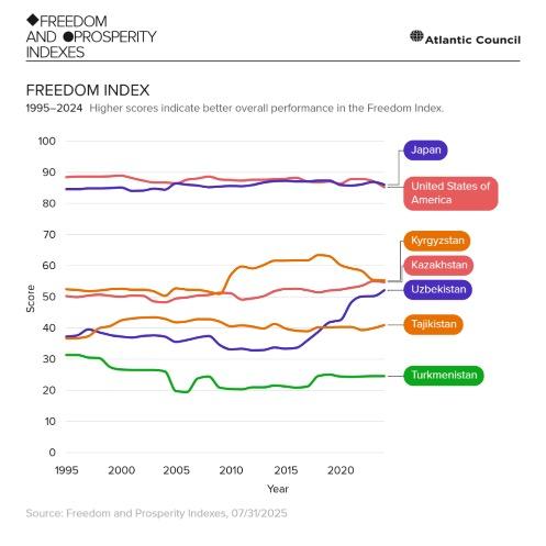 Image 1: Freedom Index of Japan, United States, Kyrgyzstan, Kazakhstan, Uzbekistan, Tajikistan, and Turkmenistan