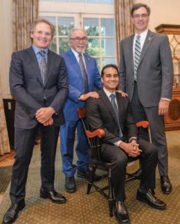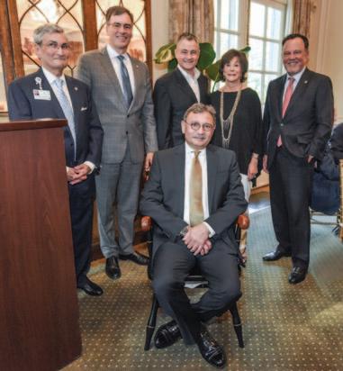 Pictured: Dr. Asim Amin, Alvin E. Levine Distinguished Chair in Melanoma Research (seated), with (standing L-R) Dr. Derek Raghavan, past president of Atrium Health Levine Cancer Institute; Ken Haynes, president of the Southeast region for Advocate Health; Daniel and Helene Levine, son and wife of the late Alvin Levine; and Armando Chardiet, president of Atrium Health Foundation.