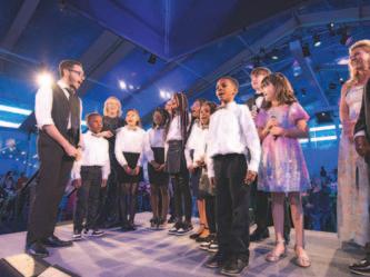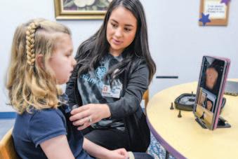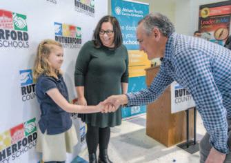 1. Eight-year-old Piper, a student at Forest City-Dunbar Elementary School, demonstrated a virtual care visit. 2. Giving Hope campaign cabinet member and benefactor Doug Lebda joined students and school leaders for a special gift announcement.