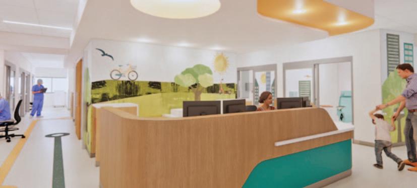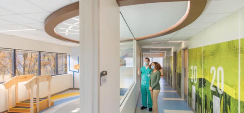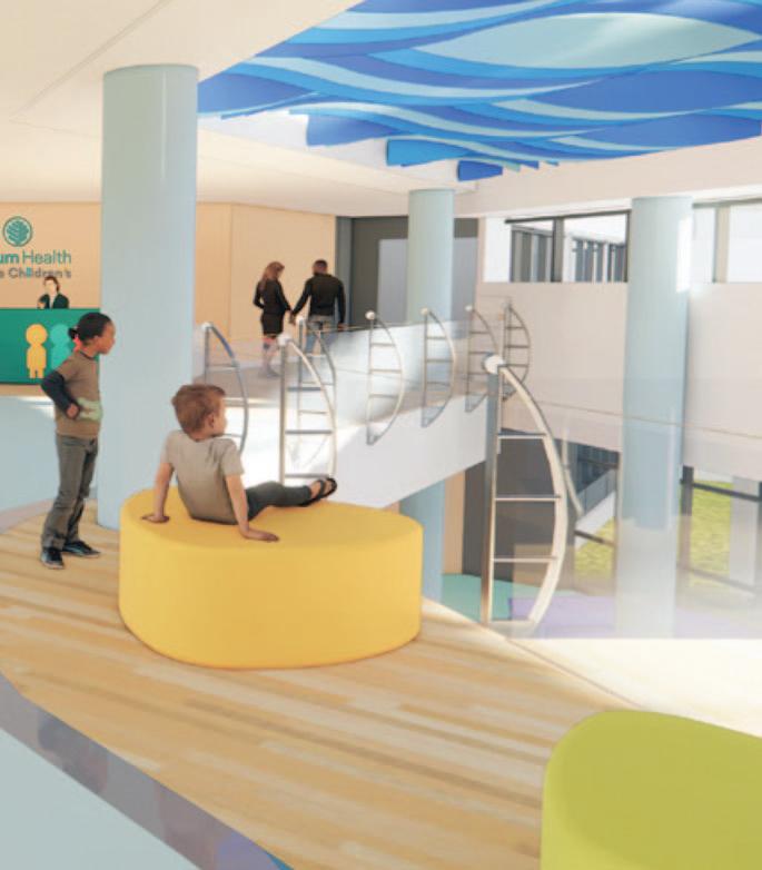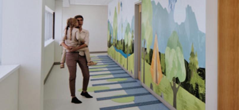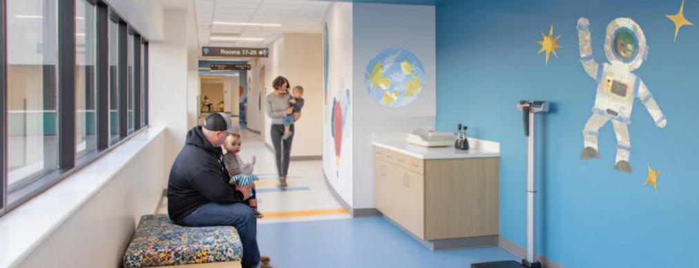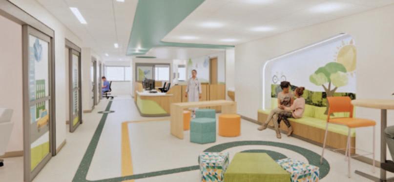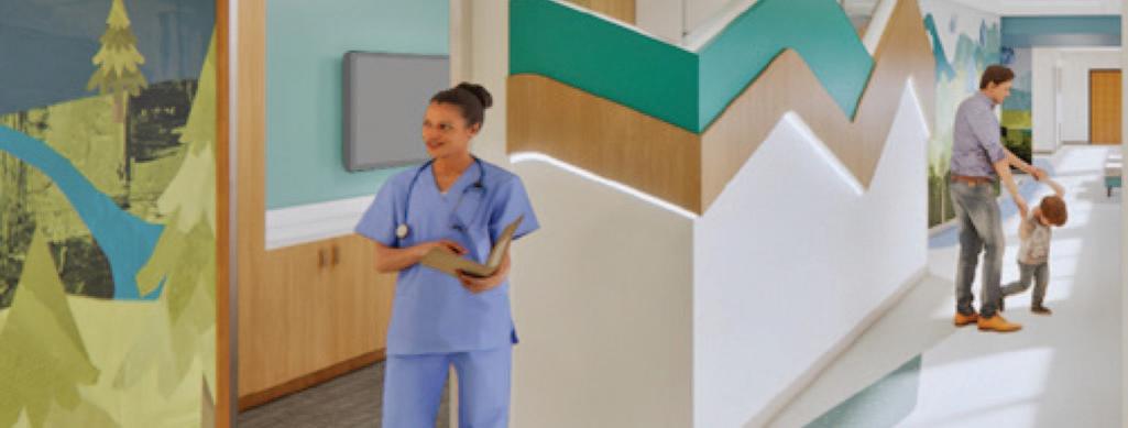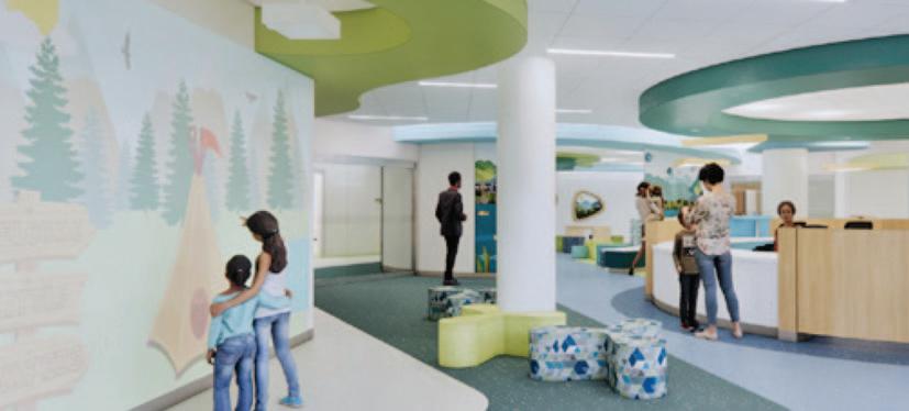 As patients and families exit the elevators on Level 4, they will be greeted with a playful lobby featuring curving walls, interactive technology, and calming “mountain” themed graphics.