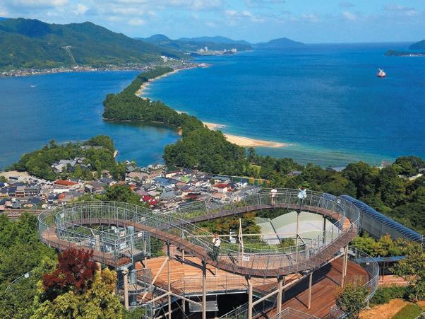 Amanohashidate has captivated people since an cient times as one of the “Three Scenic Views of Japan.” It is a geographical wonder and is consid ered a good-fortune spot. With a 3.6-km-long sandbar covered with 6,700 luxuriantly-grow ing pine trees, the entire scenery looks like an as cending dragon, a symbol of good luck in Japan.
