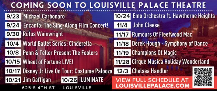 The Kentucky Center (Whitney Hall, Bomhard Theater, Clark-Todd Hall, MeX Theater) 501 West Main Street; Brown Theatre, 315 W. Broadway; and Old Forester’s Paristown Hall, 724 Brent Street. Tickets: The Kentucky Performing Arts Box Office, 502.584.7777 or KentuckyPerformingArts.org. Reserve wheelchair seating or hearing