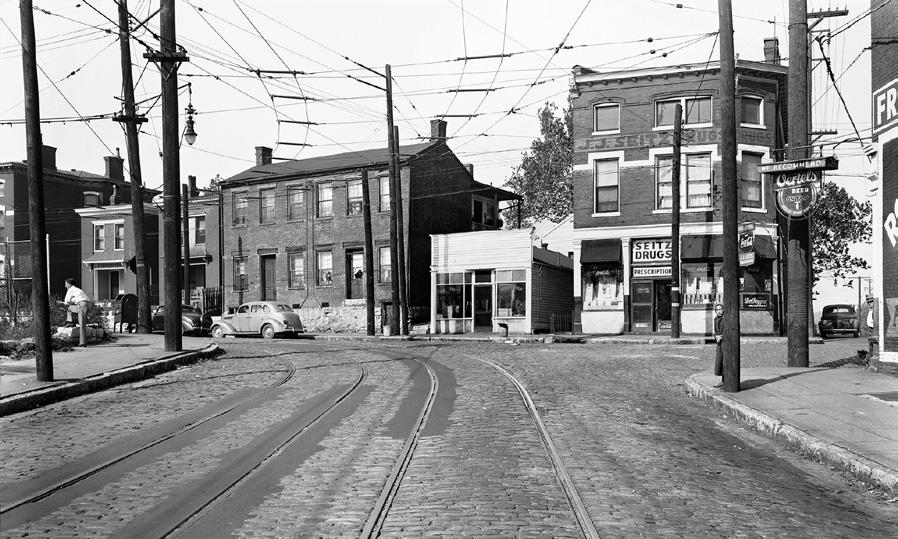 The intersection of the bricked road joining Frankfort and Story Avenues forms a gateway to Butchertown, one of Louisville's largest German settlements. In the late 1900s, the area around this view of Seitz Drugs became popular as creative local residents rehabilitated houses and business venues.