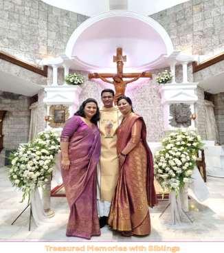 As the middle child, Leeza shares a specialplaceinherfamily.Herelder sister,TreezaJaneRodrigues,resides inKuwaitwithherhusbandandtwo lovely children, while her younger brother, Fr. Aaron Babush OCD, embraced his spiritual calling as a Carmelite priest and was ordained in June 2022. Though miles apart, distance has never diminished the warmth of their relationship, and their connection remains strong, boundbyloveandmutualsupport.