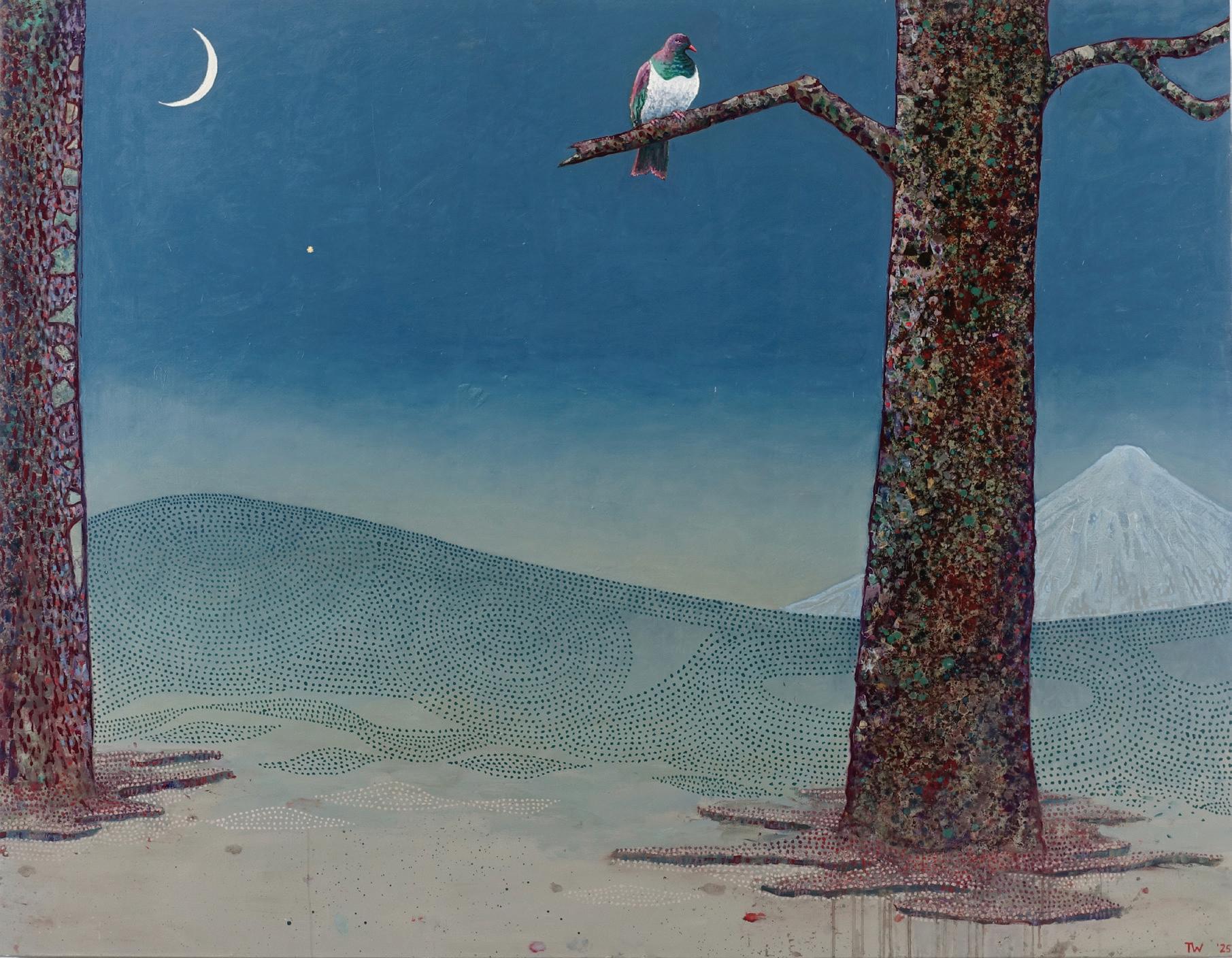 “Recently I’ve been reminiscing about those early years in Auckland and in particular, a bush-reserve near my home, called Dingle Dell. I often went there with my dog to explore the narrow tracks that networked the reserve under its dark canopy. In my memory it was a mysterious place and seemed to be inhabited by spirits.” An iridescent blue bird, a Kererū, flies out of the top of the painting, while a brooding carved Tiki-like figure stands guard over the forest below.