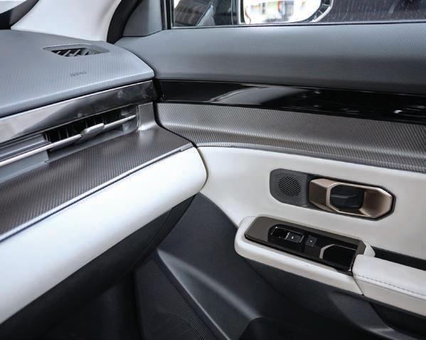 H-shaped elements are evident all-throughout the exterior such as the LED horizontal lamp with daytime running lights (DRL), front bumper garnish and radiator grille, as well as rear tailli hts These are carried o er to the inside specifically the front dashboard’s mood lights and aircon-vents and the stitching of the seats. This motif is a reinterpretation of Hyundai’s ‘H’ emblem made to complement the All-New Santa Fe’s new design identity.