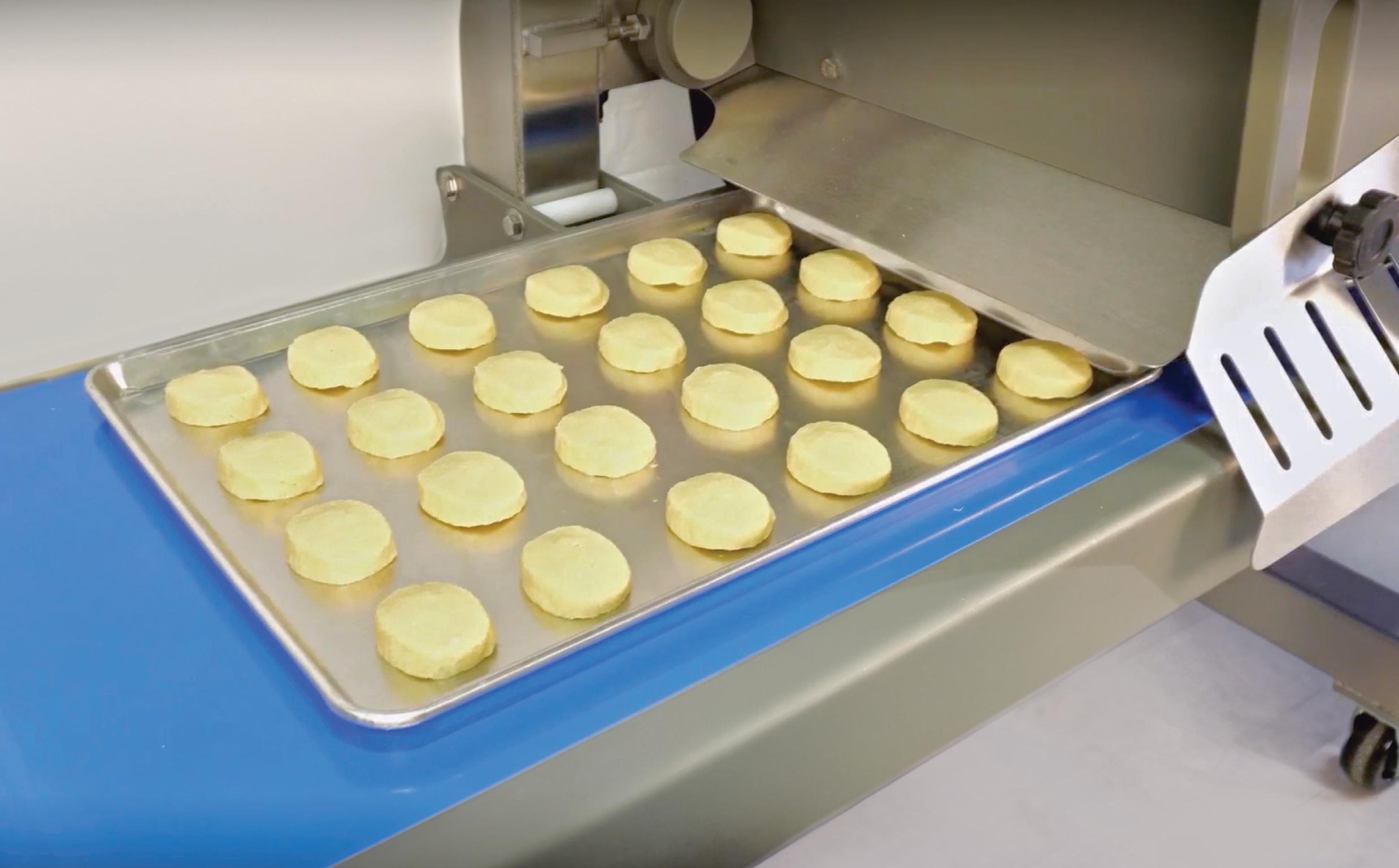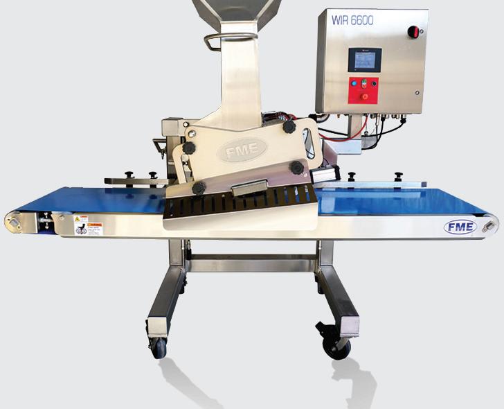 Daryl Verchère-Glover, VP, showcases the company’s induction-heated Teflon knife, which can cut through inclusions and sticky doughs during cookie production. www.fmefoodmachinery.com