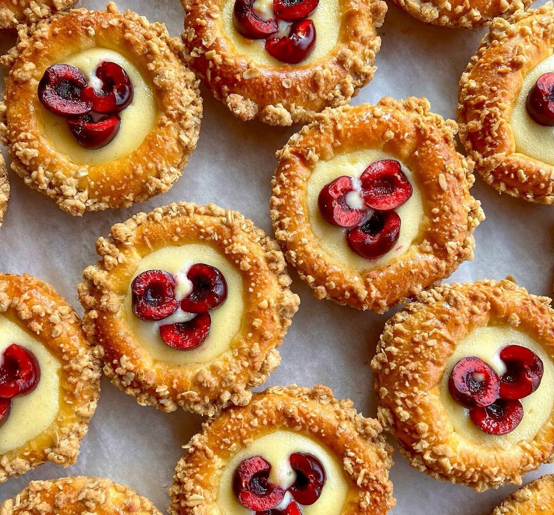 Cherries add a rich crimson coloring and juicy flavor to an assortment of baked goods ranging from Swiss rolls and galettes to pies and brioche.
