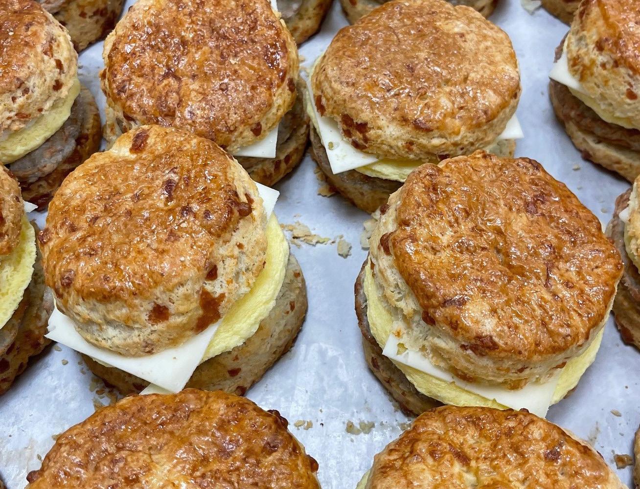 The morning bake kicks off around 4:30 a.m. with breakfast musthaves, including the top-selling breakfast sandwich, the McAMIE: sausage, egg and cheese on a homemade cheddar biscuit.
