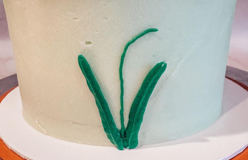 With a leaf tip, pipe two long leaves starting at the base of the cake, releasing just before pulling the tip away at the end to create the leaf’s point.
