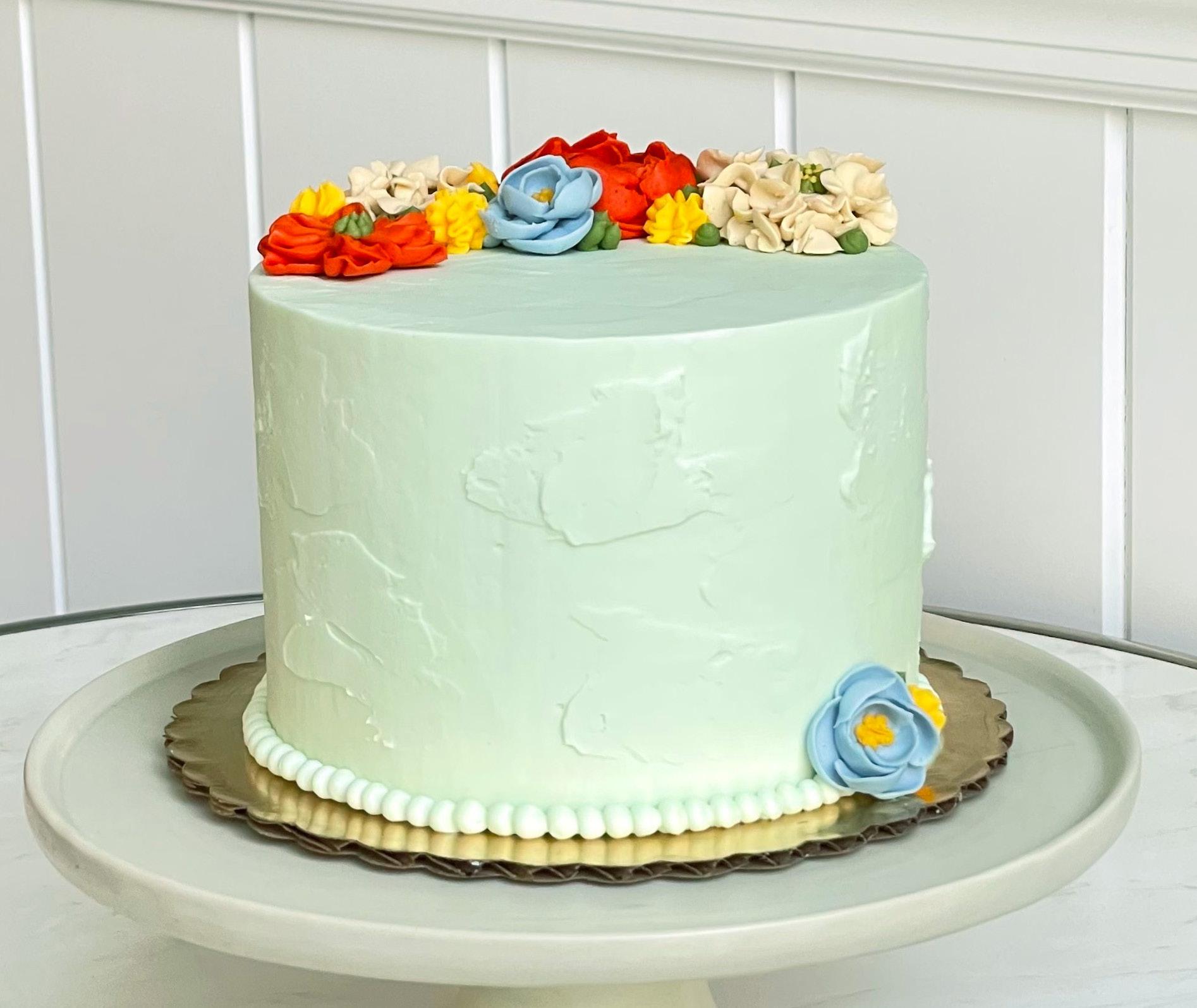 Repeat along the perimeter of the cake, spacing flowers evenly apart.