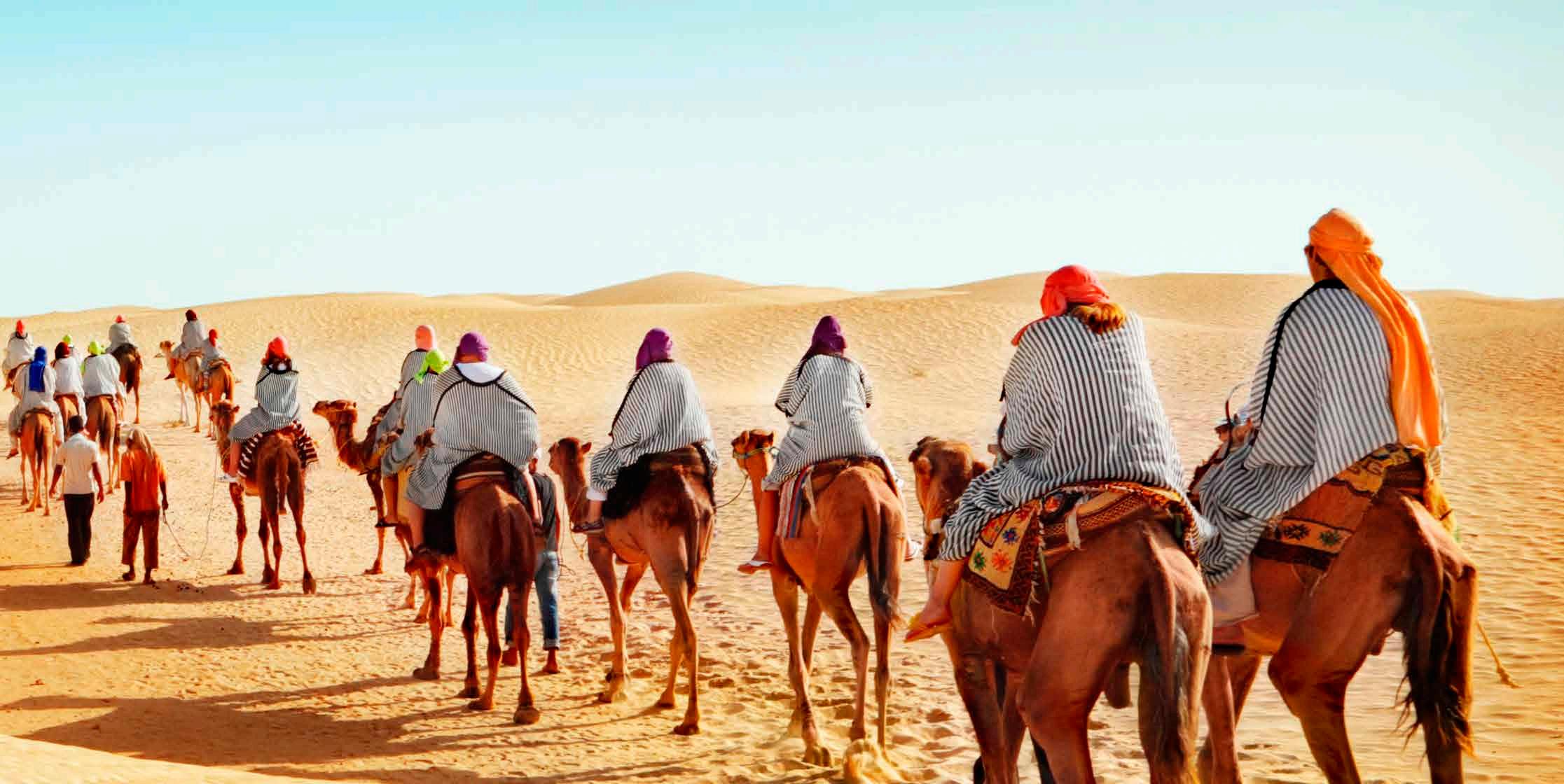 Proseguimos nuestro camino hasta el gran Erg Chebbi (Desierto de Dunas), donde efectuaremos un cambio de nuestros vehículos 4x4 por el vehículo de tracción animal más famoso del desierto, ¡los dromedarios!