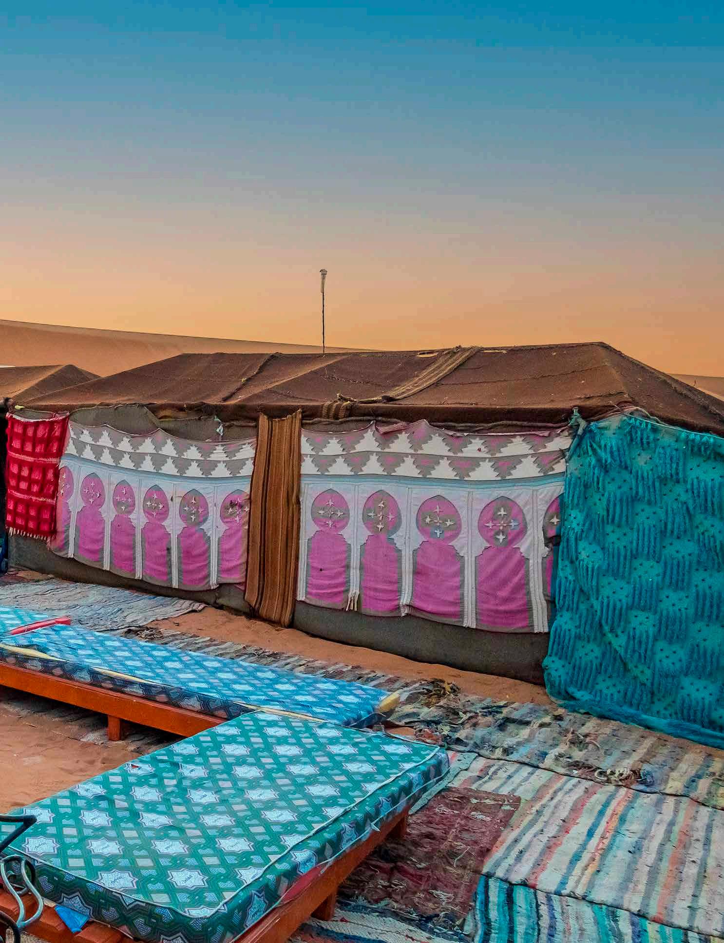 así, ¿se la podremos devolver a Sus Majestades? Después de este mágico momento, podremos disfrutar de la cena al mejor estilo bereber con folklore antes de irnos a dormir bajo el increíble cielo estrellado del desierto, en una auténtica pero moderna haima con baño privado.