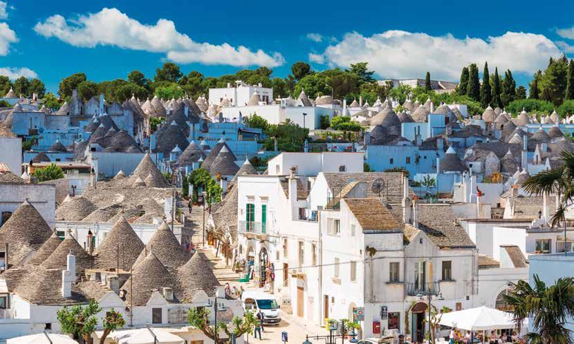 bonitos de la Puglia y de toda Italia: primero nos detendremos en Locorotondo para dar un paseo por su particular centro histórico que conserva una estructura circular, formado por casitas blancas de mampostería y techo puntiagudo, junto a iglesias neoclásicas. Después, continuaremos hasta Martina Franca, construida sobre una colina y con un centro histórico rodeado de murallas. Tendremos tiempo libre para pasear por la Piazza XX de Settembre y, a través de Porta Santo Stefano, llegar hasta Piazza Roma desde donde accederemos a sus callejuelas, conociendo el exterior de su Ayuntamiento, el antiguo Palacio Ducal, y numerosos palacios y edificios barrocos, que salpican el casco antiguo. Nuestra ruta de hoy seguirá por el valle de Itria hasta alcanzar la localidad de Alberobello, capital de los “trulli”: construcciones de una sola planta circular, pintadas de blanco y coronadas por cúpulas de piedra gris en forma de cono. Podremos disfrutar de tiempo libre para pasear por su centro histórico y visitar el Trullo Sovrano: casa de labor típica del siglo XVIII, de planta cónica, que alberga un museo de artes y costumbres con muebles y objetos originales. Traslado a nuestro hotel en la región de Alberobello. (Cena incluida en opción paquete de comidas). Alojamiento.