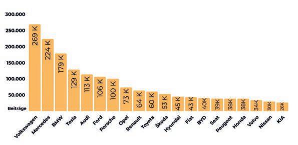 Toyota und Ford führen international Im vergangenen Jahr wurden weltweit die meisten Beiträge im Zusammenhang mit Autos, Fahrzeugen, Motoren und der Automobilindustrie im Allgemeinen zu Toyota (rund 2 Millionen Berichte) und Ford (rund 1,9 Millionen Berichte) veröffentlicht. Im internationalen Ranking überholten die beiden Marken somit Mercedes (1,7 Millionen Beiträge), VW (1,5 Millionen Beitrage) und BMW (1,4 Millionen Beiträge). Mit 1,2 Millionen Onlineartikeln landete Tesla auf Platz 7. Unter die Top 20 schafften es mit Toyota, Honda, Hyundai, Nissan, Suzuki, KIA und BYD auch sieben Marken aus Ostasien.