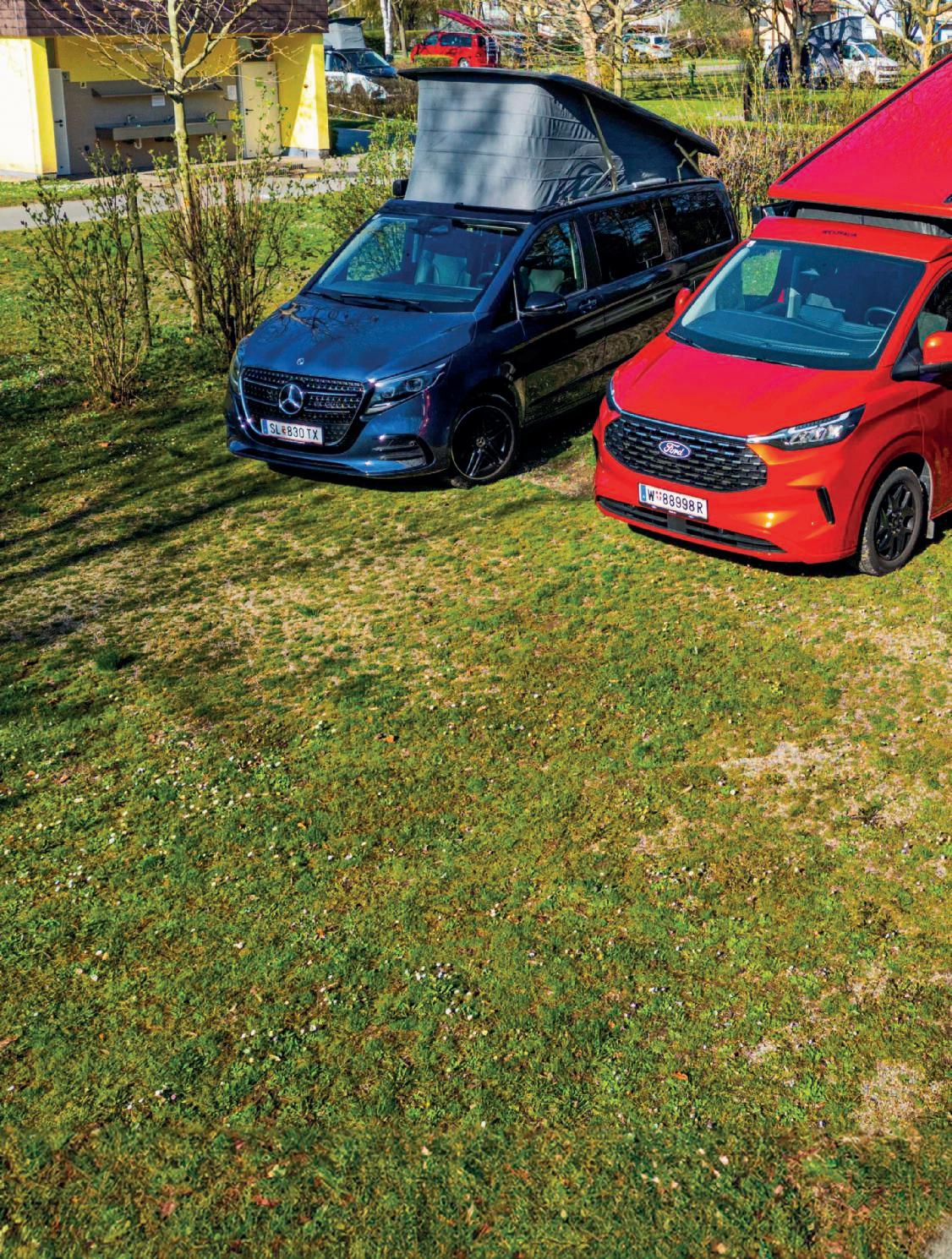 Zum Schluss kommt der unangenehme Teil dieser multifunktionalen Fahrzeuge, der Preis. Wer ohne Küchenzeile das Auslangen findet, startet noch im fünfstelligen Bereich, wer echte Camper haben möchte, wird schnell sechsstellig. Der Ford Nugget startet mit guter Ausstattung bei 99.535 Euro, der Testwagenpreis lag mit stärkerem Motor und Automatik bei 111.062 Euro. Der VW California kostet mindestens 94.704 Euro, der Testwagen kam auf 123.185 Euro. Die Mercedes V-Klasse Marco Polo startet bei 97.530 Euro, unser Testwagen in Topmotorisierung mit Allradantrieb beginnt bei 111.266 Euro, das vollausgestattete Testauto brachte es auf über 160.000 Euro. Wer mit dem Ford liebäugelt, für den gibt’s eine Hiobsbotschaft. Kurz nach dem Test mussten wir erfahren, dass der Verkauf in Österreich mit Ende April 2025 eingestellt wurde. Allerdings lohnt sich der Import aus Deutschland, da sich trotz NoVANachzahlung ein ähnlicher Preis ergibt. Tipp: Wer auf den Plugin-Hybrid wartet, der in den nächsten Monaten in Deutschland starten soll, spart sich die NoVA voraussichtlich zur Gänze. •