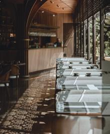 con seguridad y el otro se abandona a la experiencia. La música, curada y mezclada con precisión, subraya momentos del menú y define el tempo del servicio —otra capa sensorial que guía en ausencia de luz—. En conjunto, todo el dispositivo logra que la oscuridad no sea desorientación, sino lenguaje.