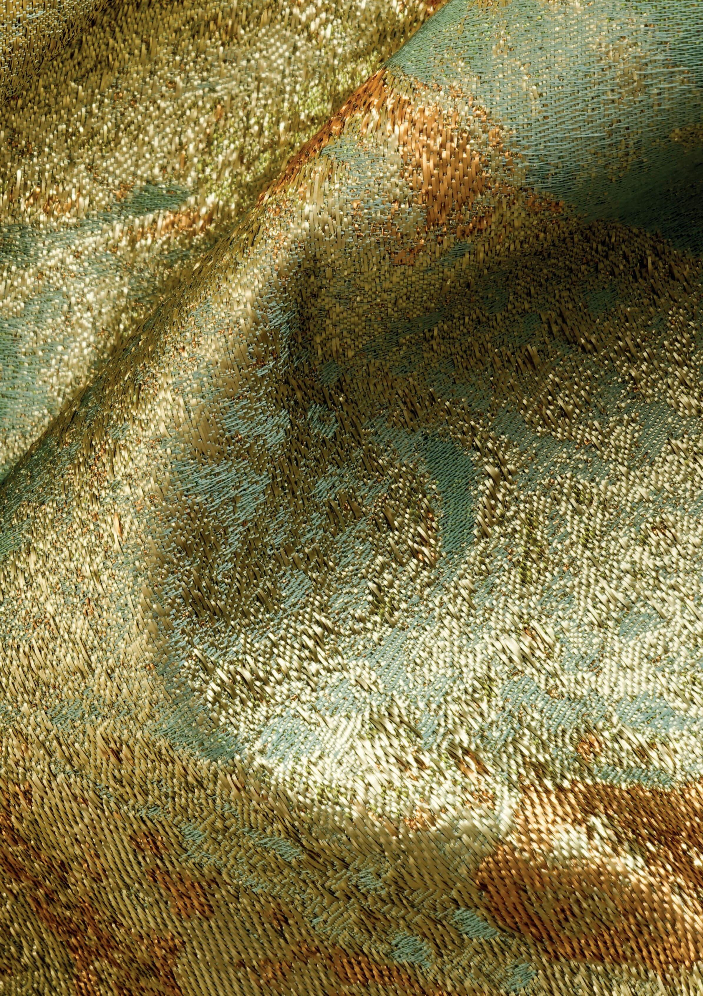 translate the original drawings into new abstract forms that convey a sense of lively movement. Metallic yarns are used to create a sparkling effect and accentuate the perception of movement, dissolving into the silk background. All fabrics are reversible.