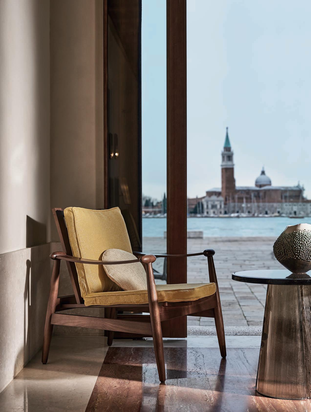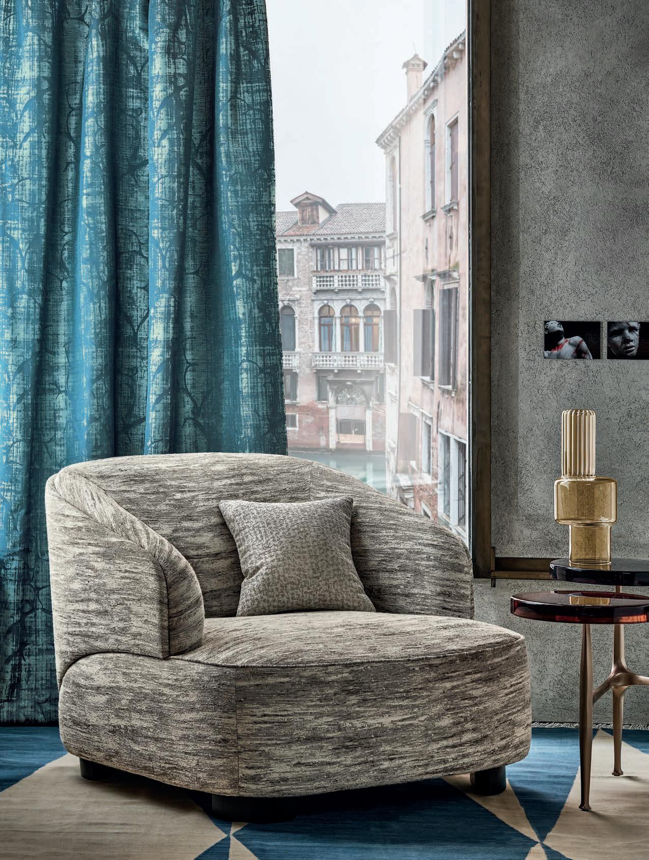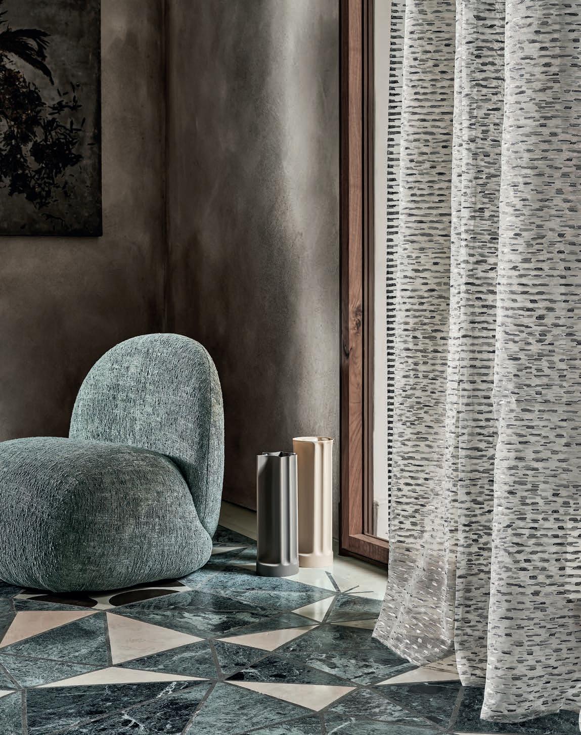 A “glassy” fabric that evokes the artistic glass creations of the Venetian architect and designer Carlo Scarpa.