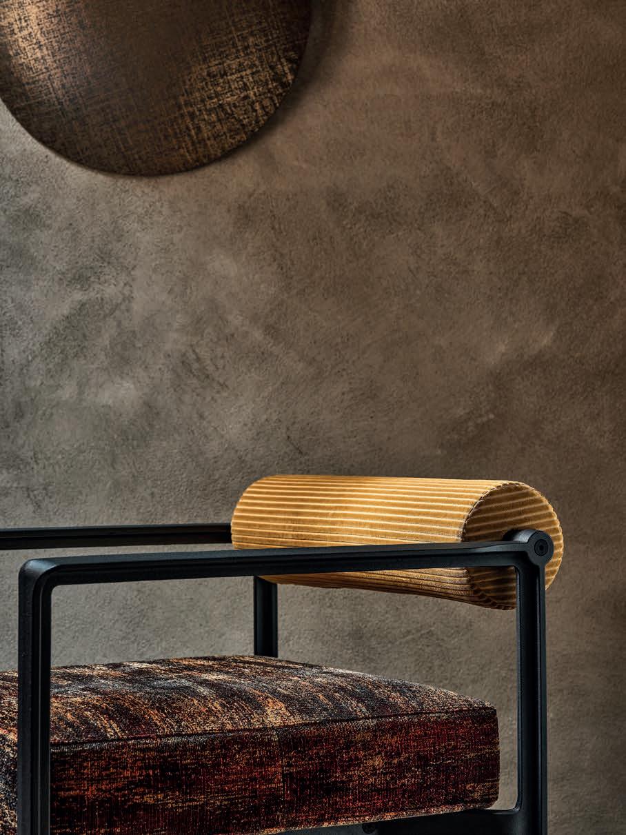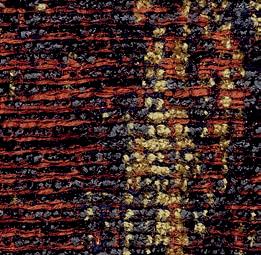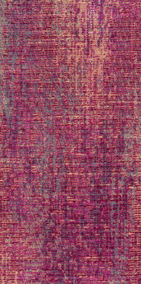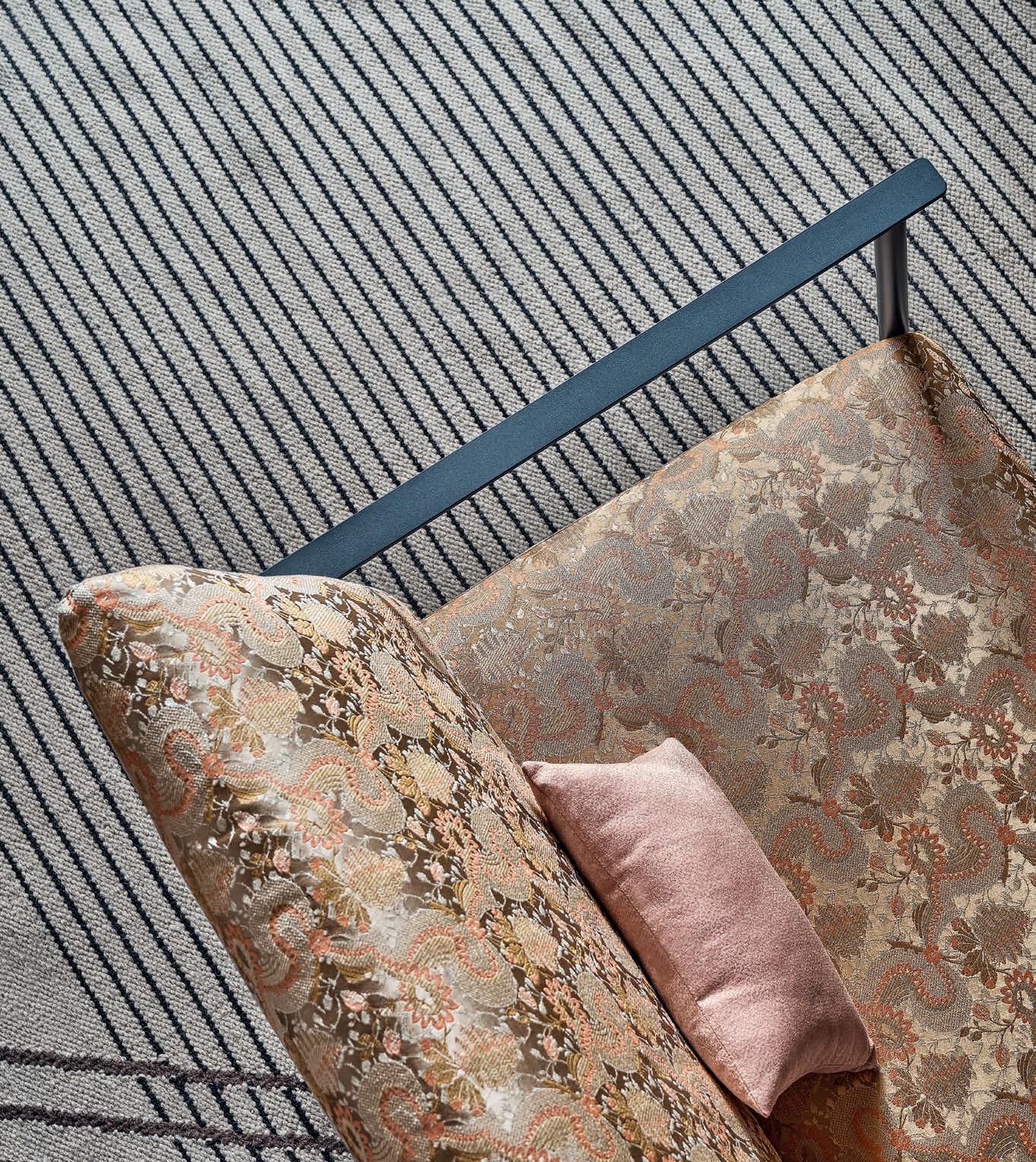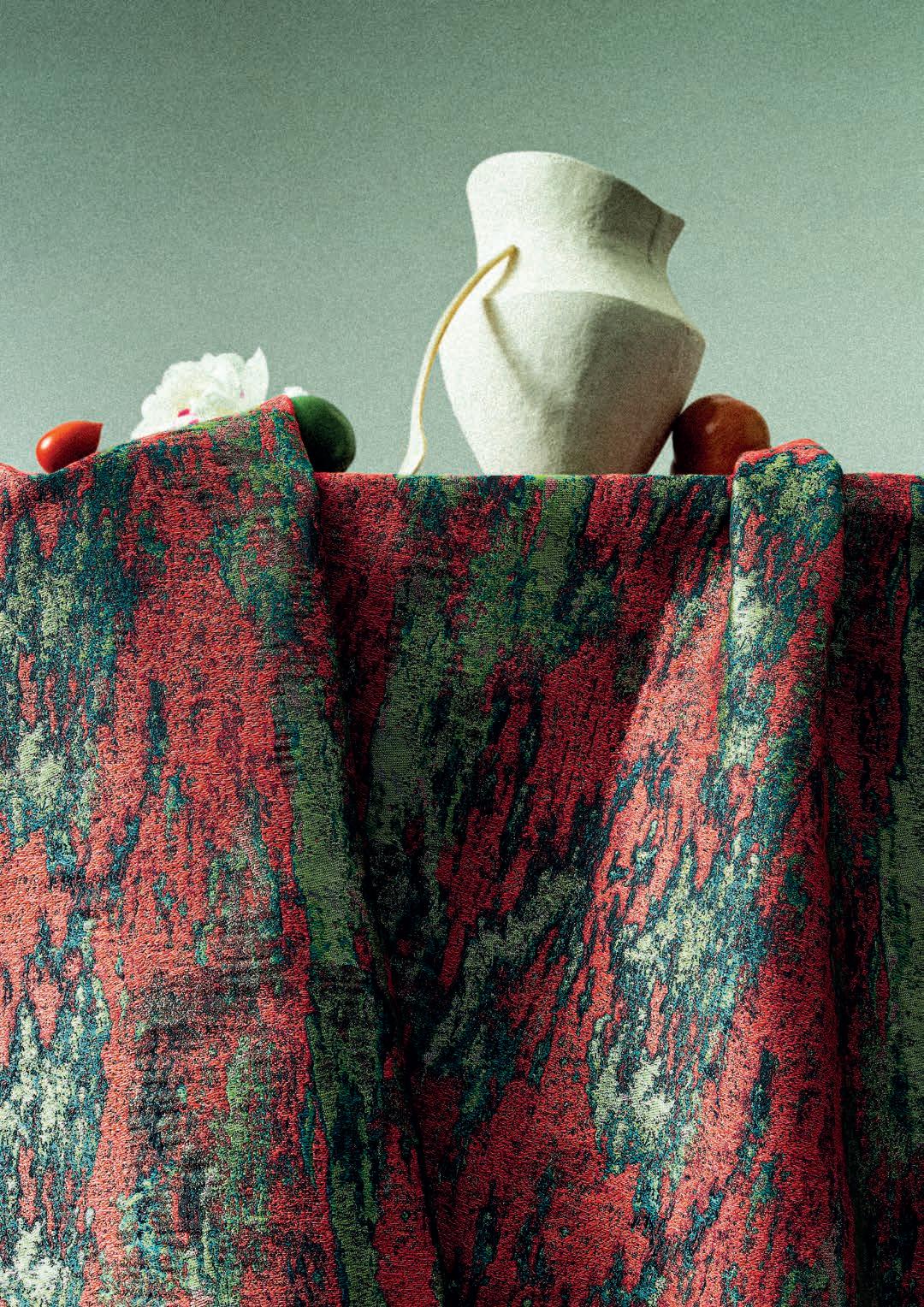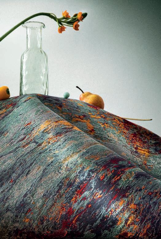 Velluto jacquard di grande effetto. Nasce da un mix di diversi filati ed è frutto di una elaborata costruzione tecnica. Una texture materica che ricorda la superficie di un pregiato tappeto vissuto. In un mélange di colori a tratti cangianti, effetti di fondo ed effetti di pelo danno vita a suggestive striature e rimandano a creazioni pittoriche contemporanee.